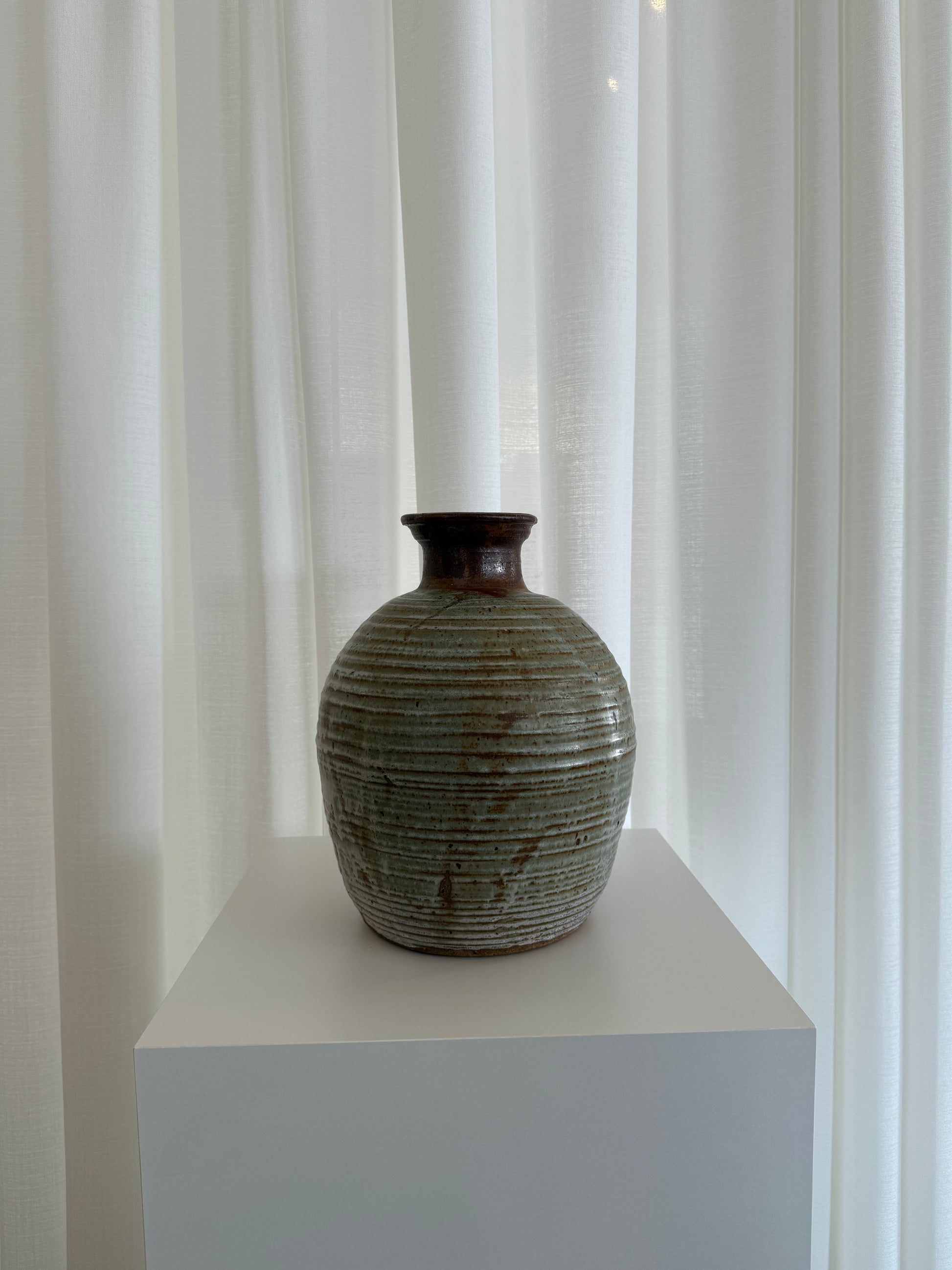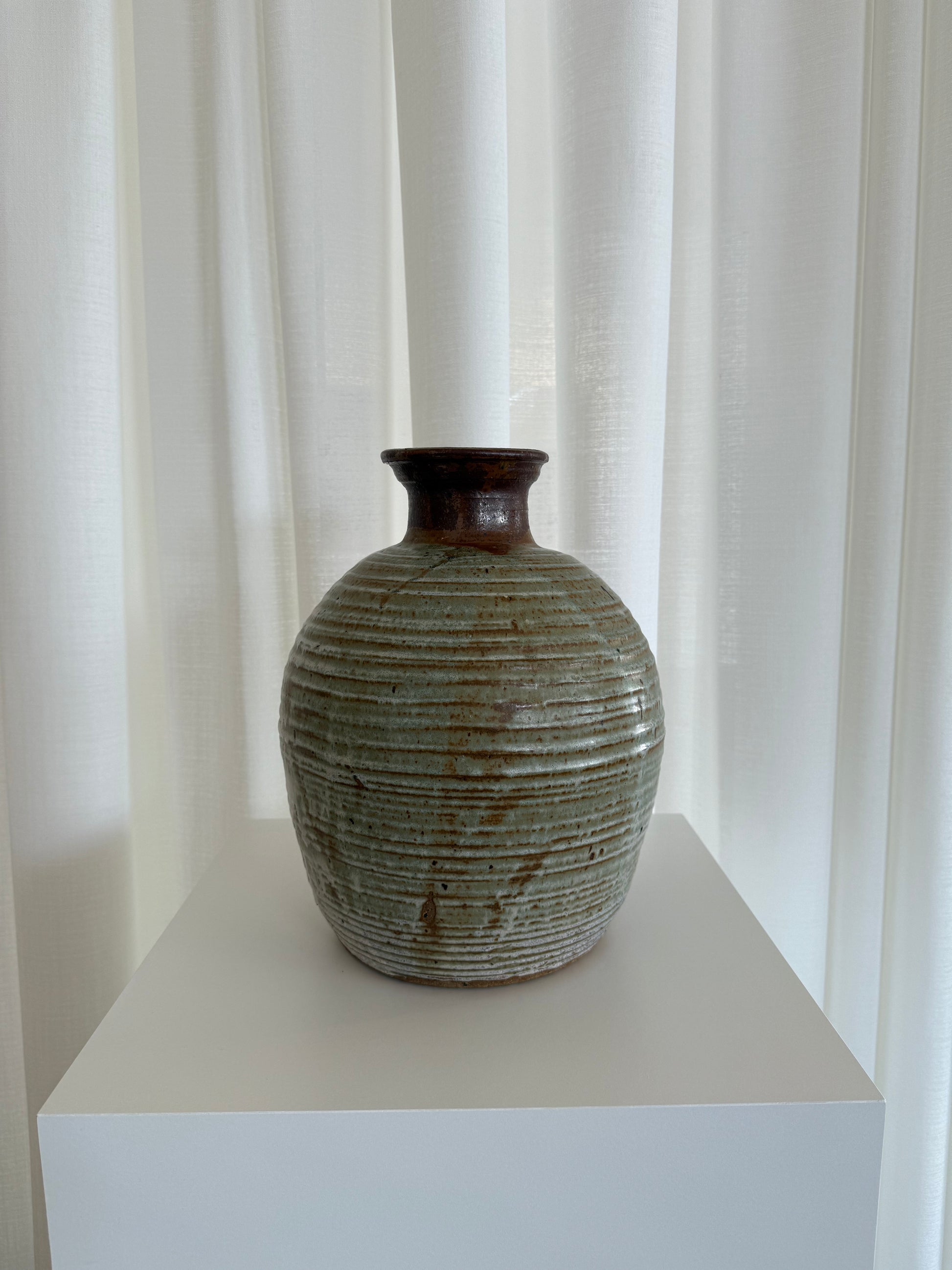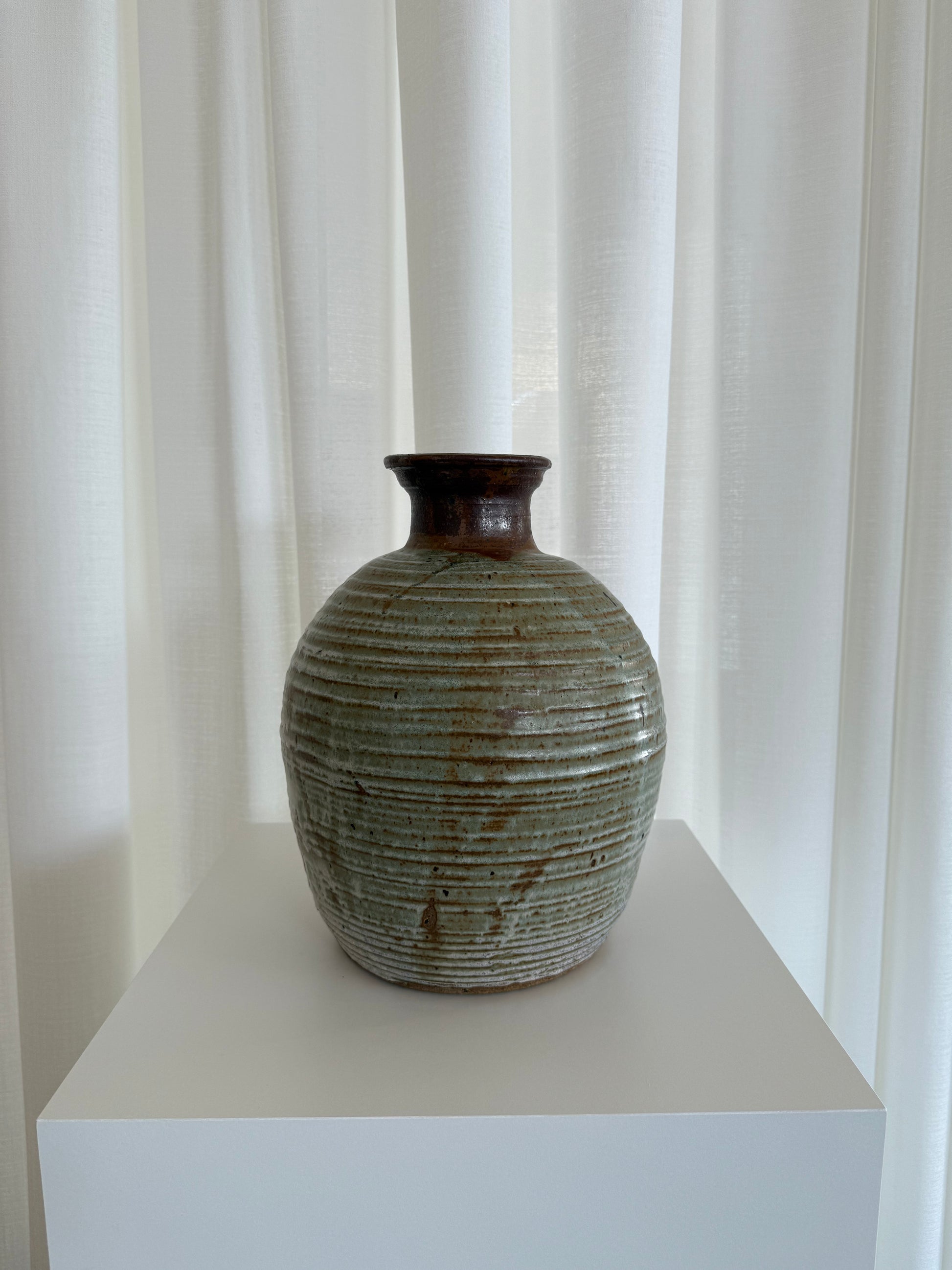 Hand thrown 1974 David Handly Studio vessel. Multi colored with celadon glazed of rust & ivory.