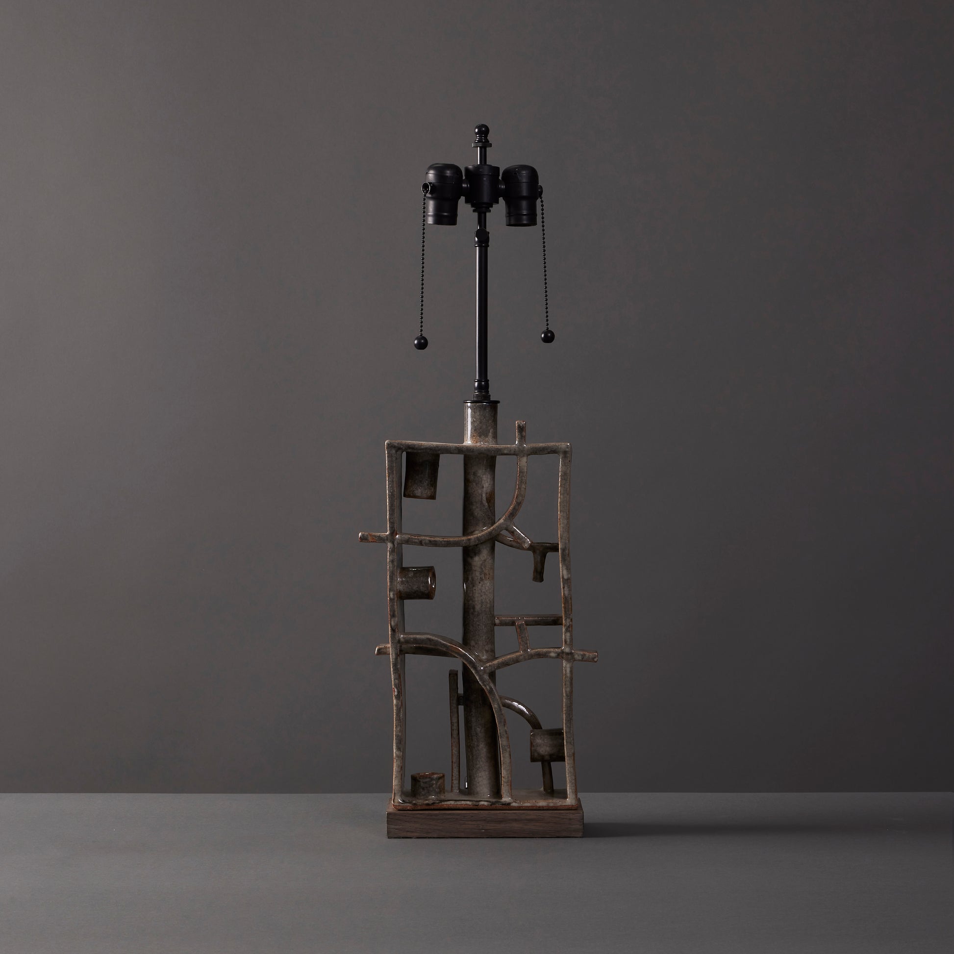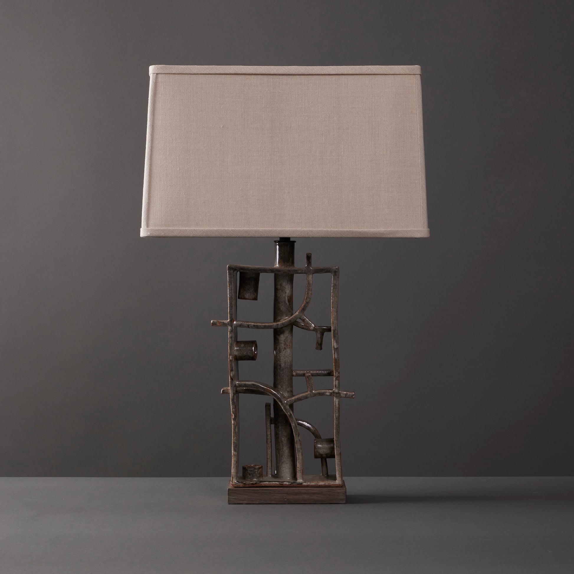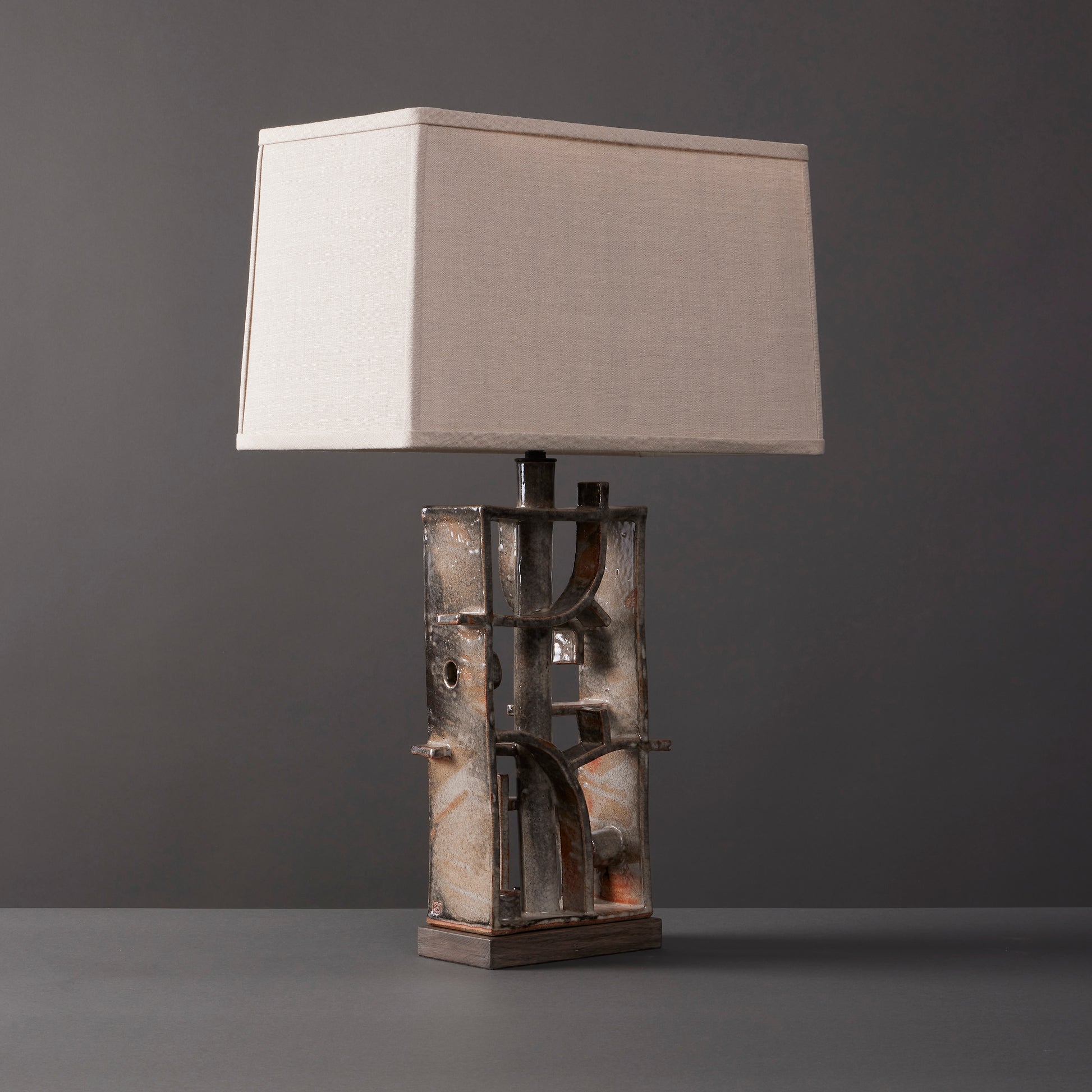 Materials: Hand-built glazed stoneware, stained wood base, linen shade
