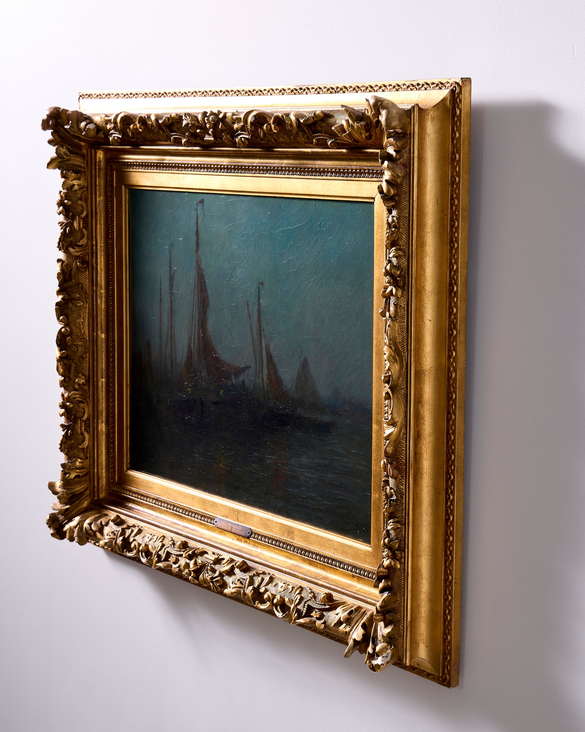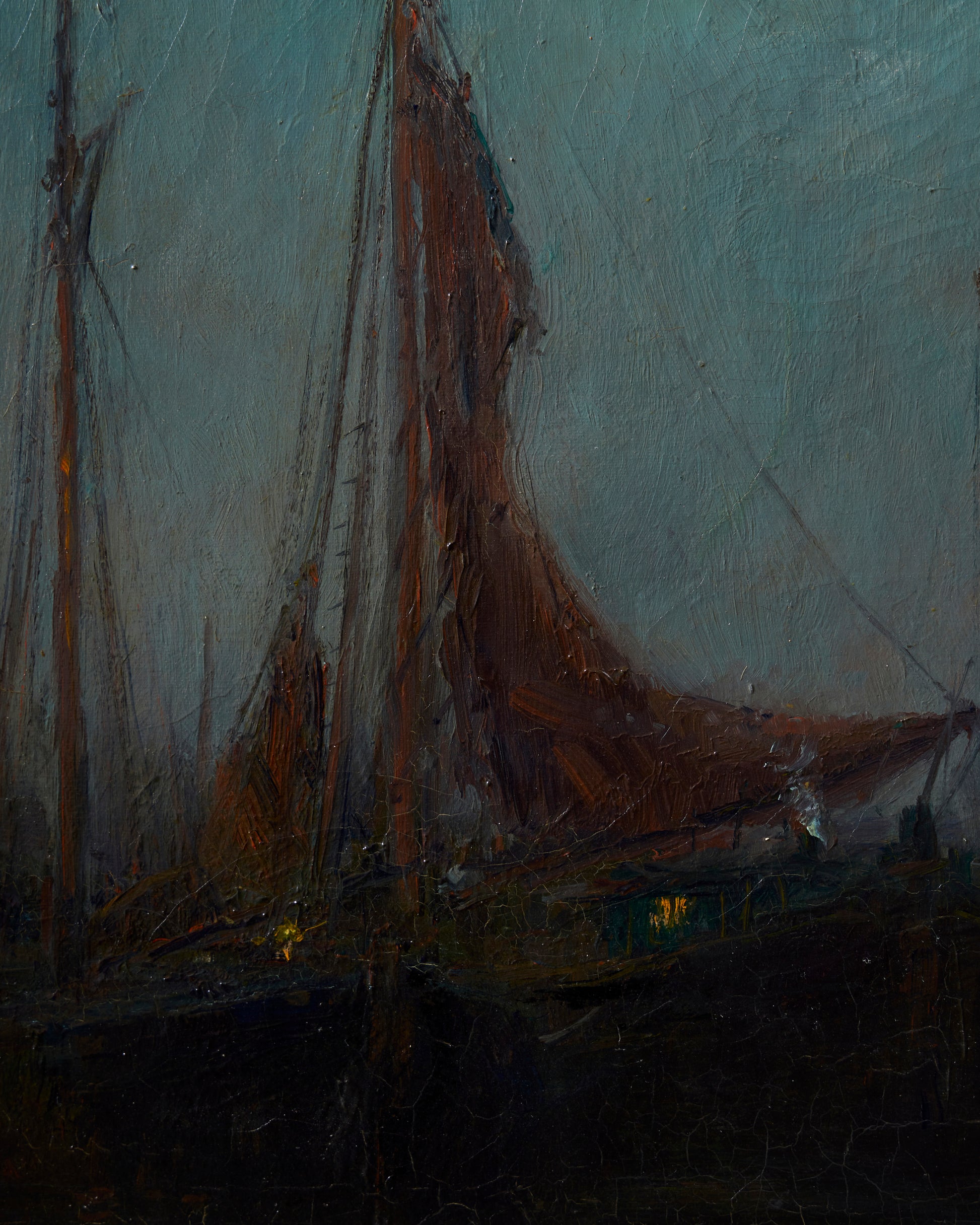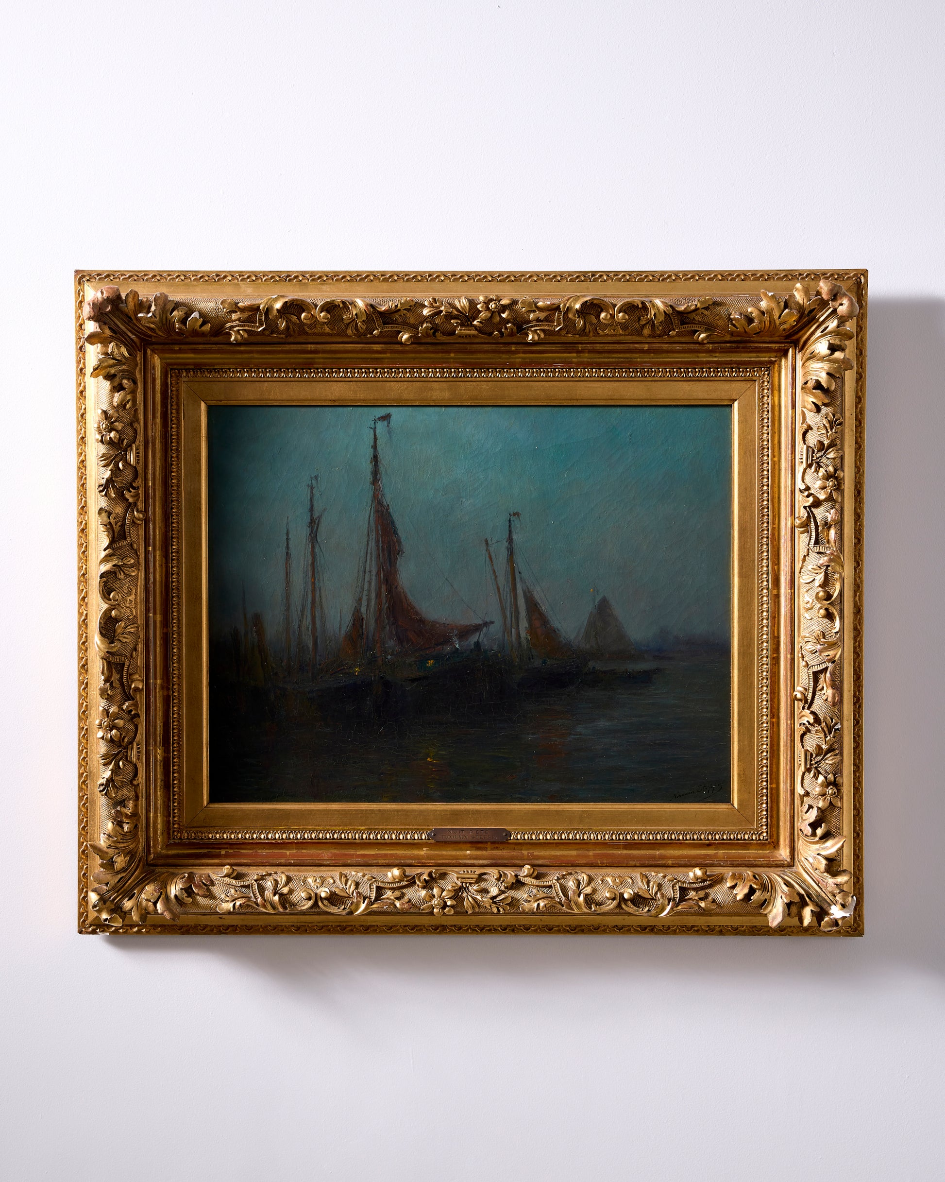 A Romain Steppe oil painting. The composition captures a schooner mid-journey, its sails billowing as it navigates choppy waters beneath a dim, moody sky.
