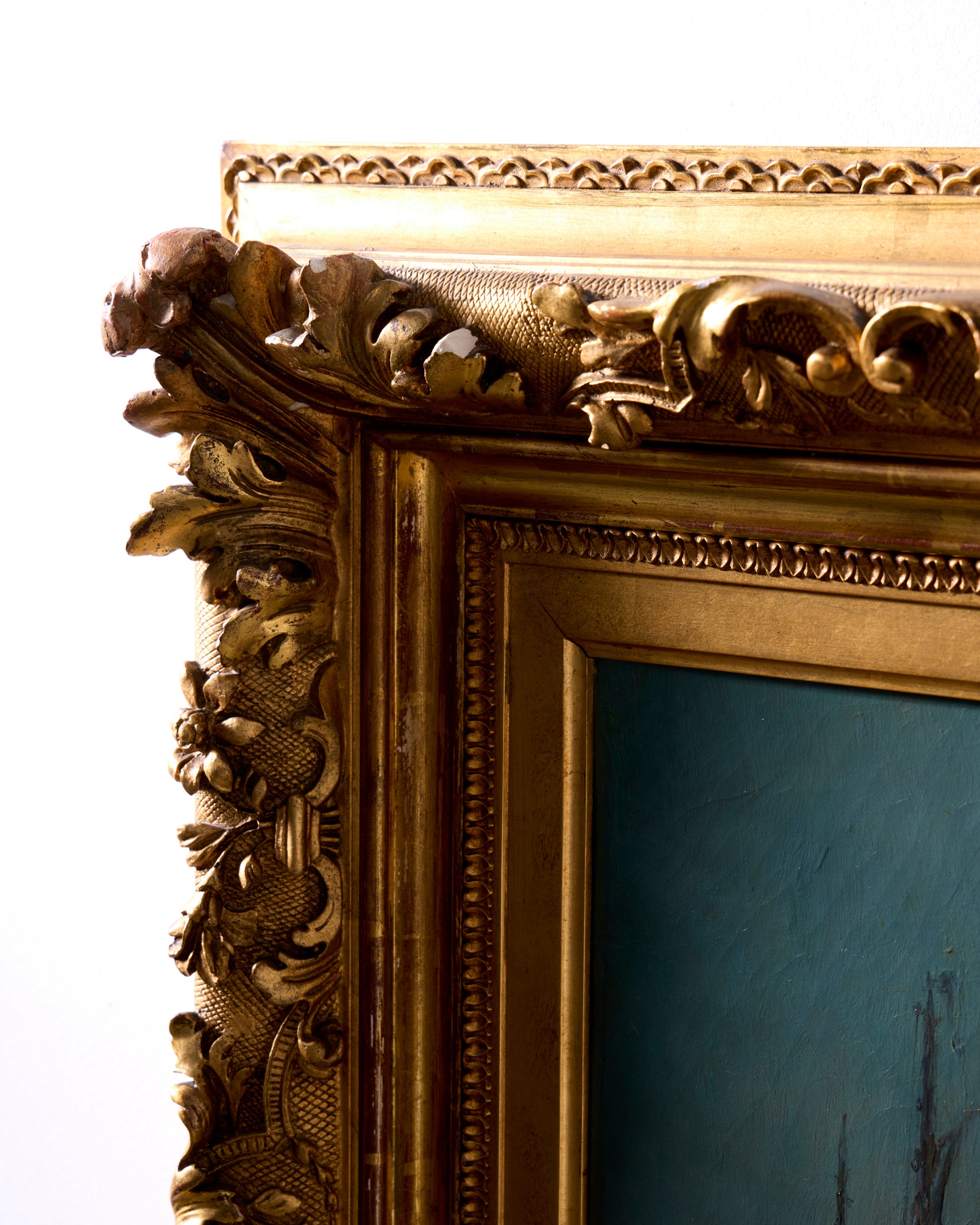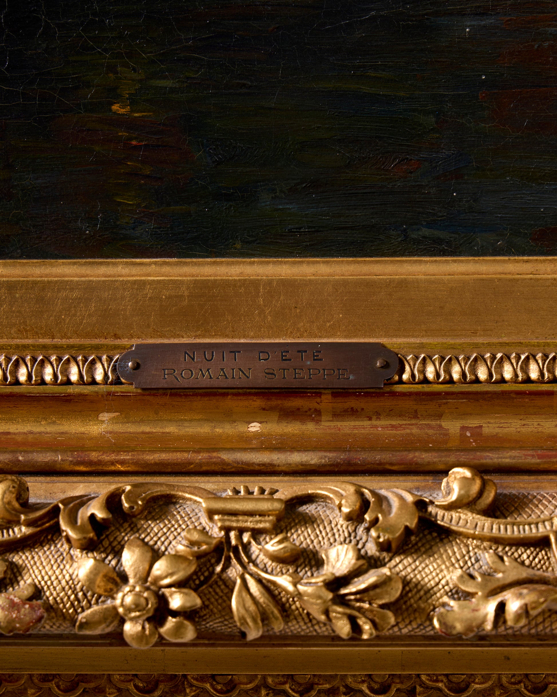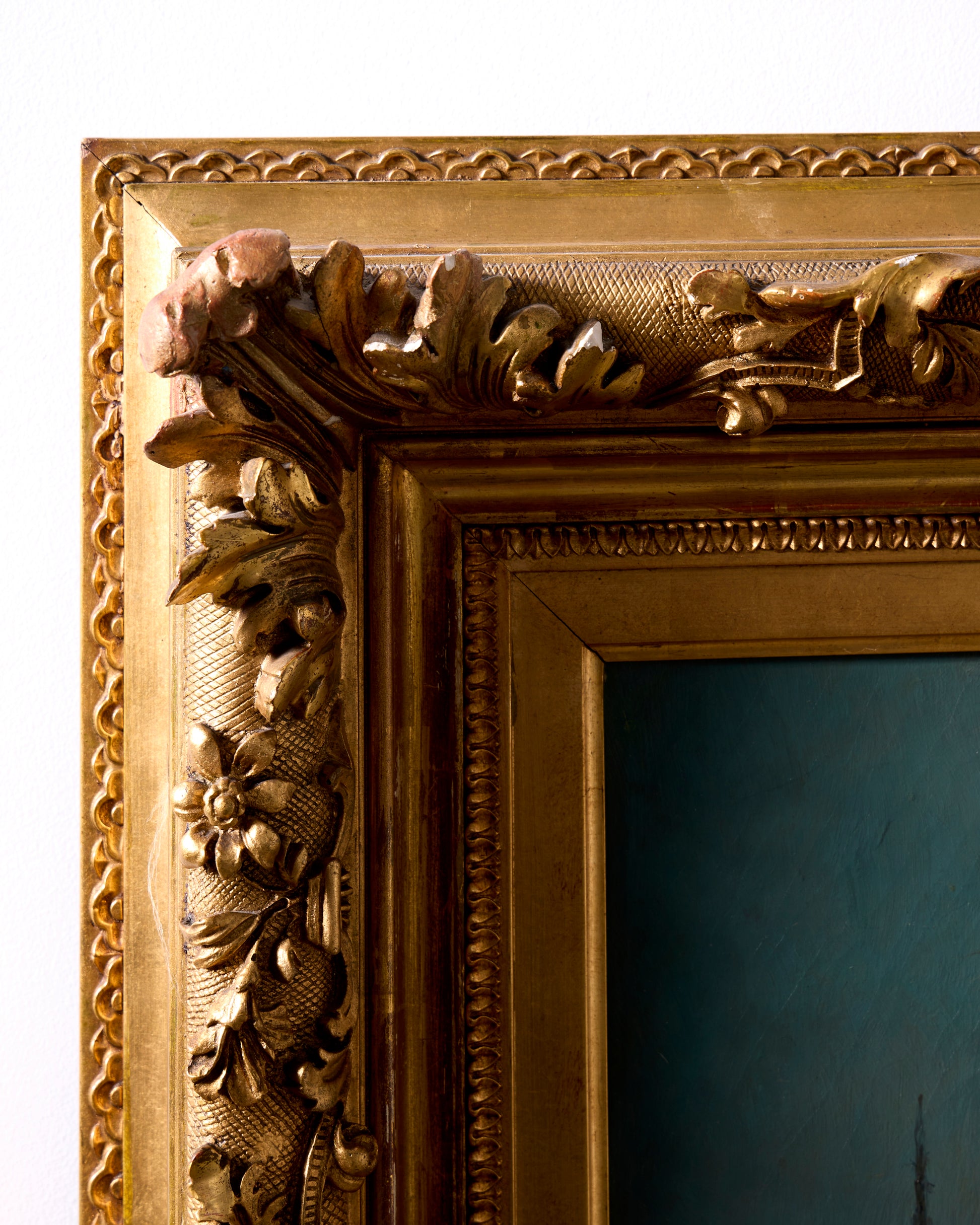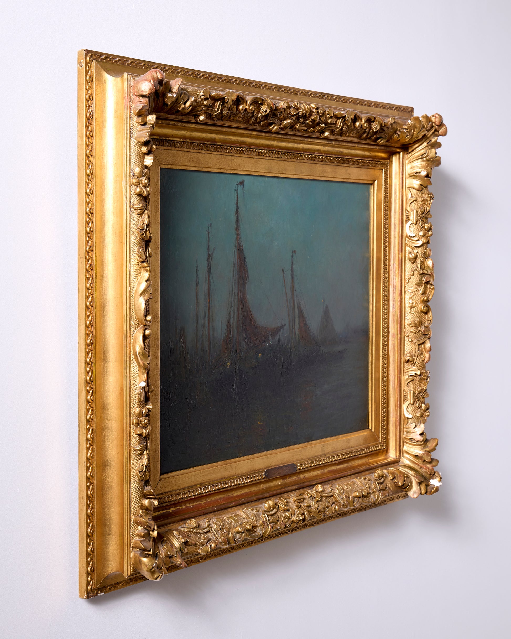 A Romain Steppe oil painting. The composition captures a schooner mid-journey, its sails billowing as it navigates choppy waters beneath a dim, moody sky.