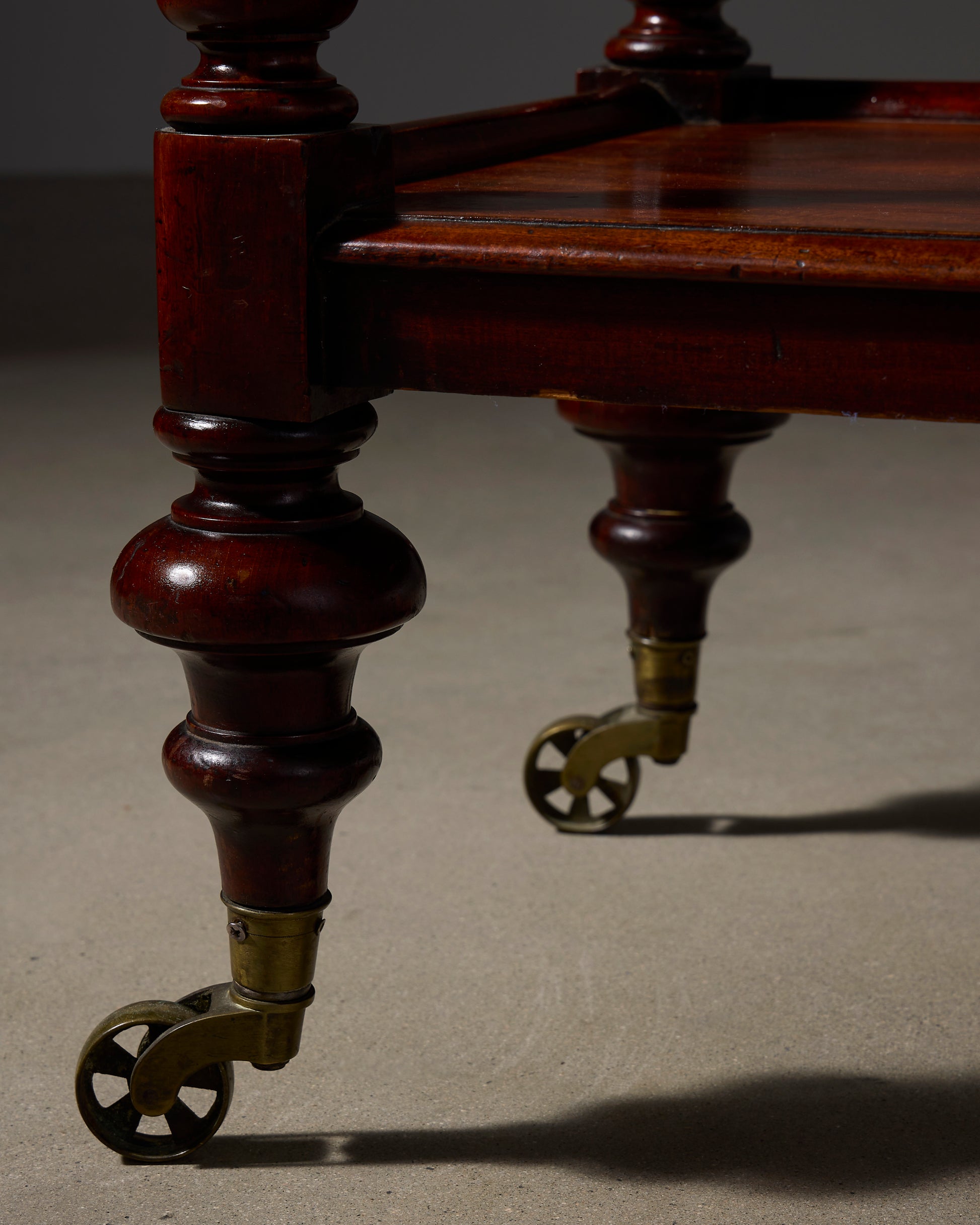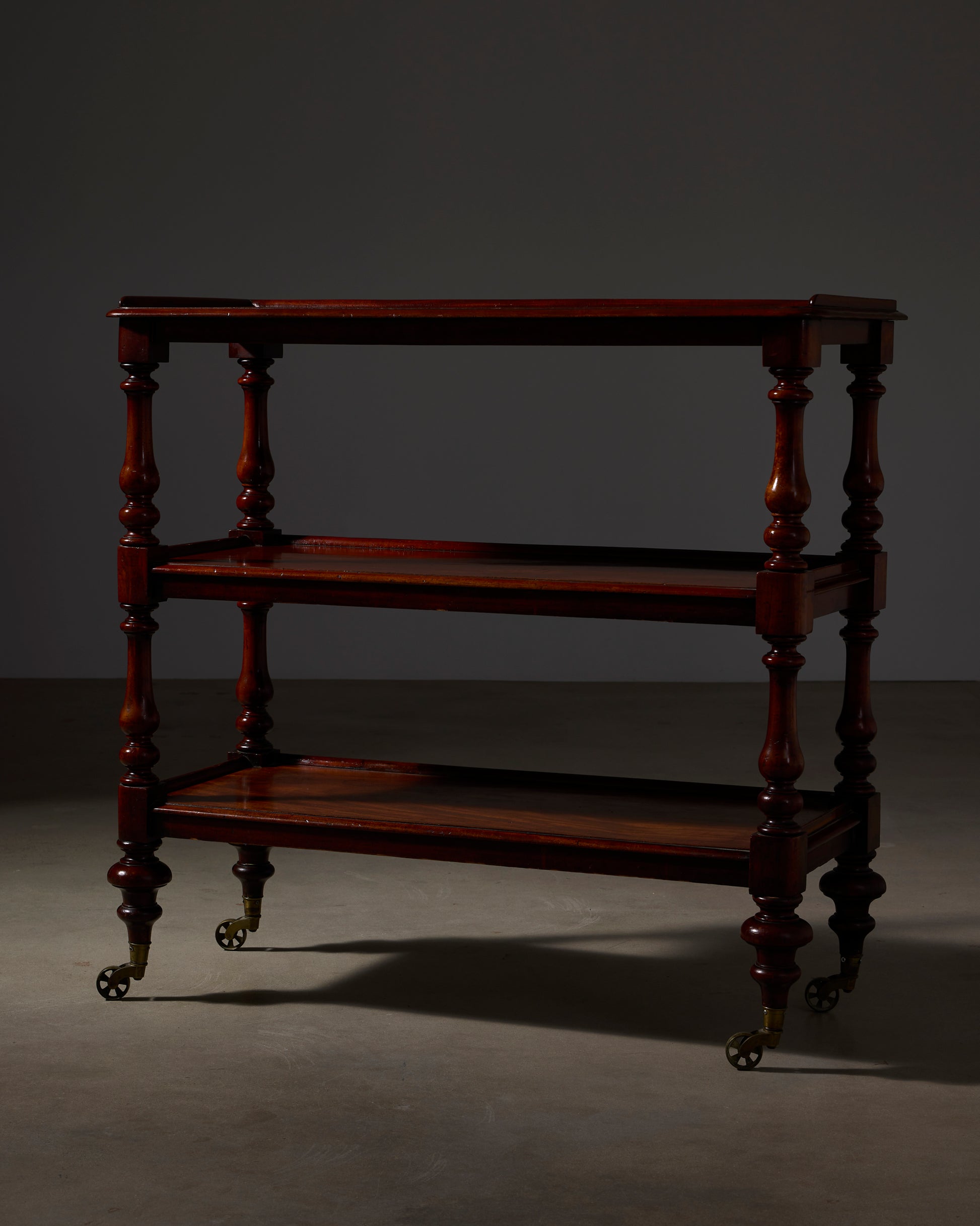 A fine English mahogany trolley server, featuring three molded-edge tiers supported by elegantly turned columns and set on brass rolling spoke casters. Often used in English country homes, these servers were rolled out after dinner, each tier offering a selection of desserts or refreshments.