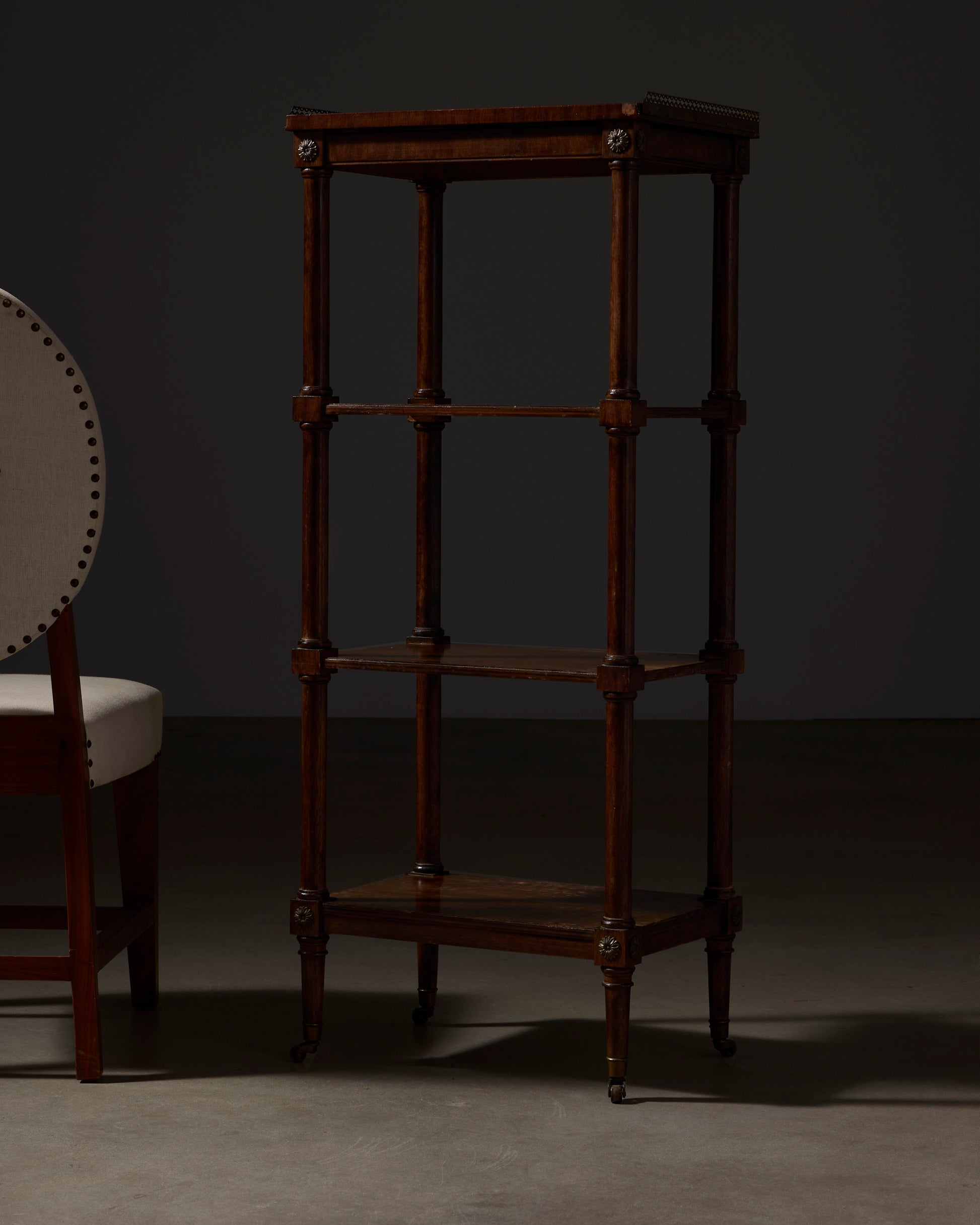 An elegant English Regency walnut étagère circa 1820, featuring four tiers and original brass casters. Its faded walnut finish and slender profile making it a stylish and functional display piece.
