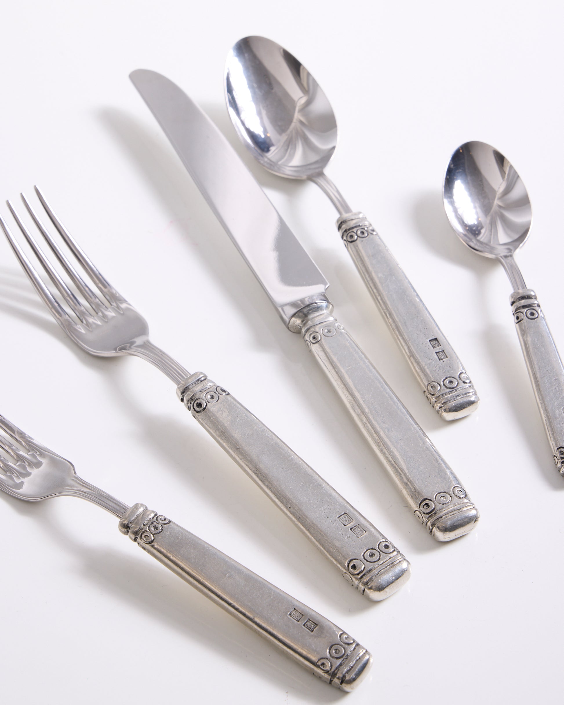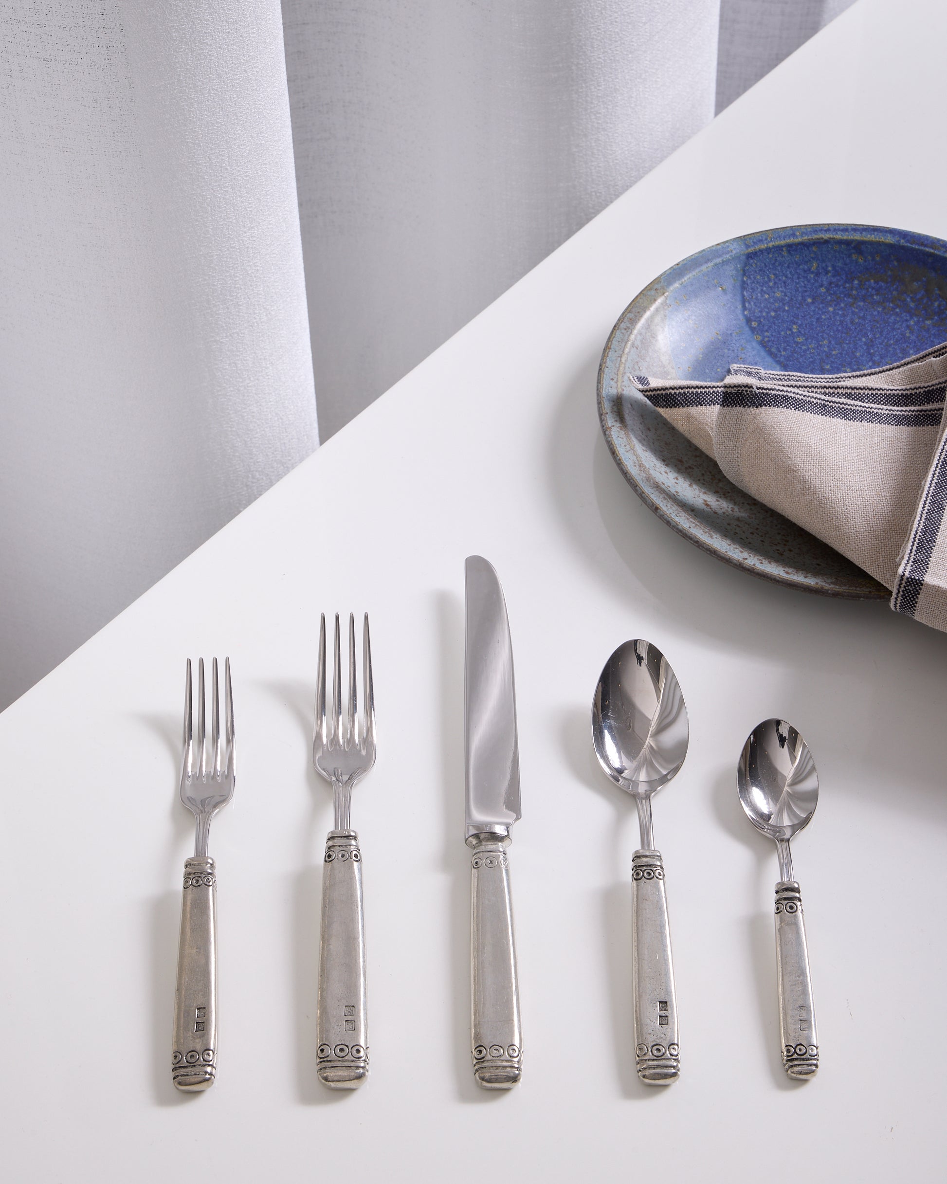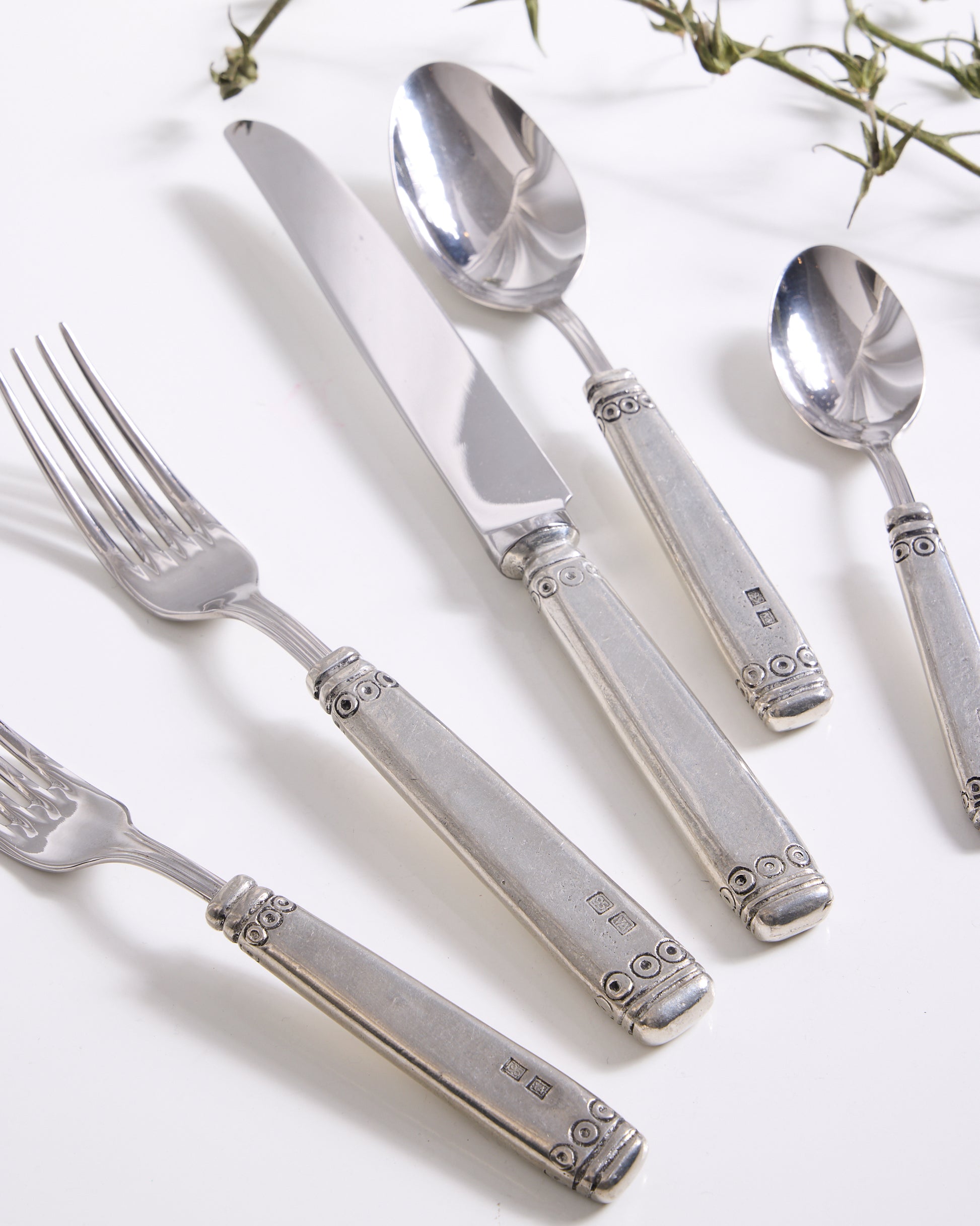 Vintage designed flatware handmade in Italy by skilled craftsmen. Food-safe pewter handles with stainless steel, dishwasher safe.