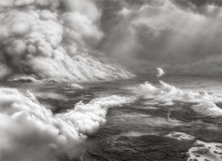 Hilary Brace is known for her intimate yet sublime charcoal drawings of waves, clouds, and dramatic, Baroque skies. Working reductively on darkened polyester film, she removes charcoal with erasers and handmade tools to reveal luminous compositions that feel almost otherworldly. Critics have described her technique as both sorcerous and poetic, conjuring light and space with remarkable delicacy.