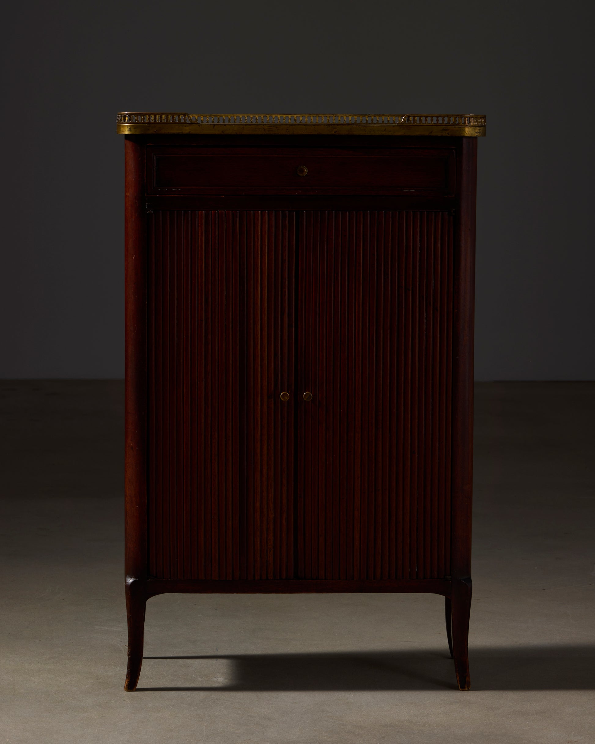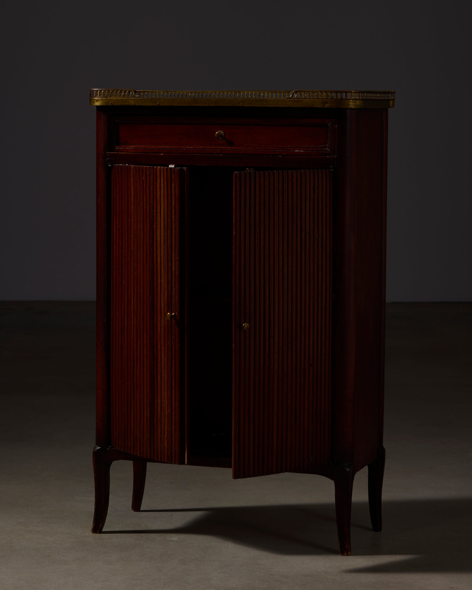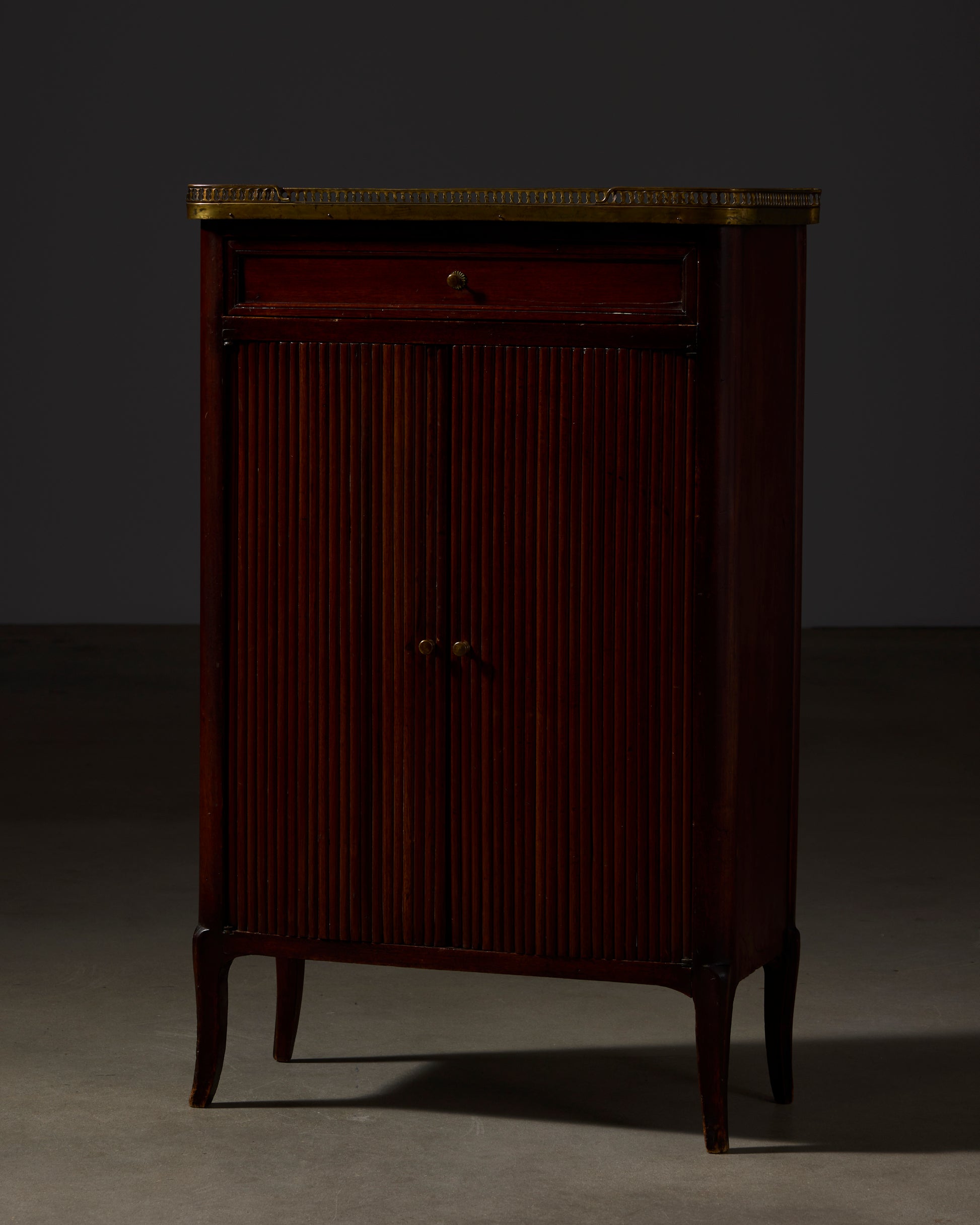 A Louis XVI Style cabinet with a white marble top, rounded corners, and a bronze pierced gallery. Featuring bronze detailing, gilt handles, and slender wooden legs.