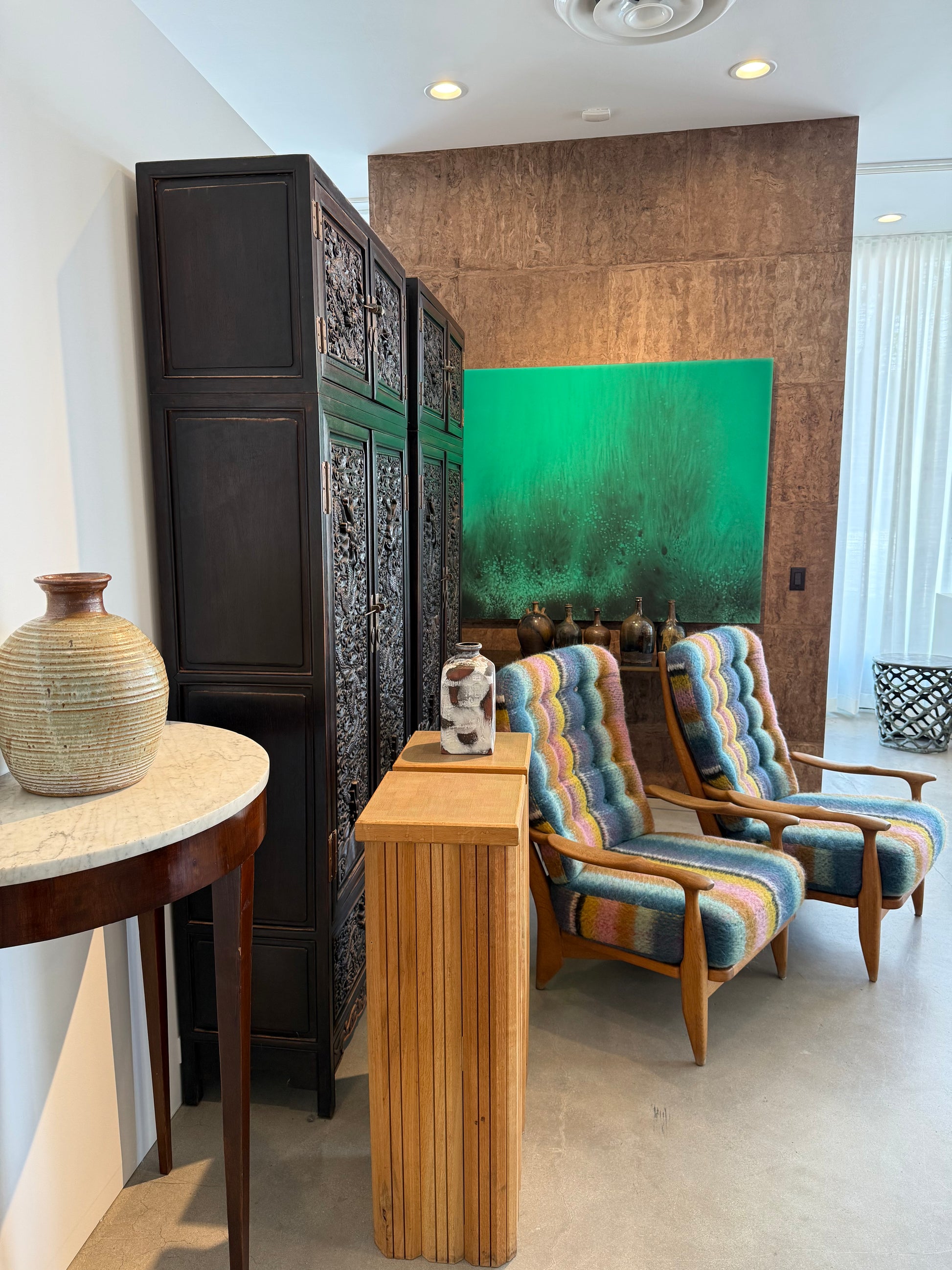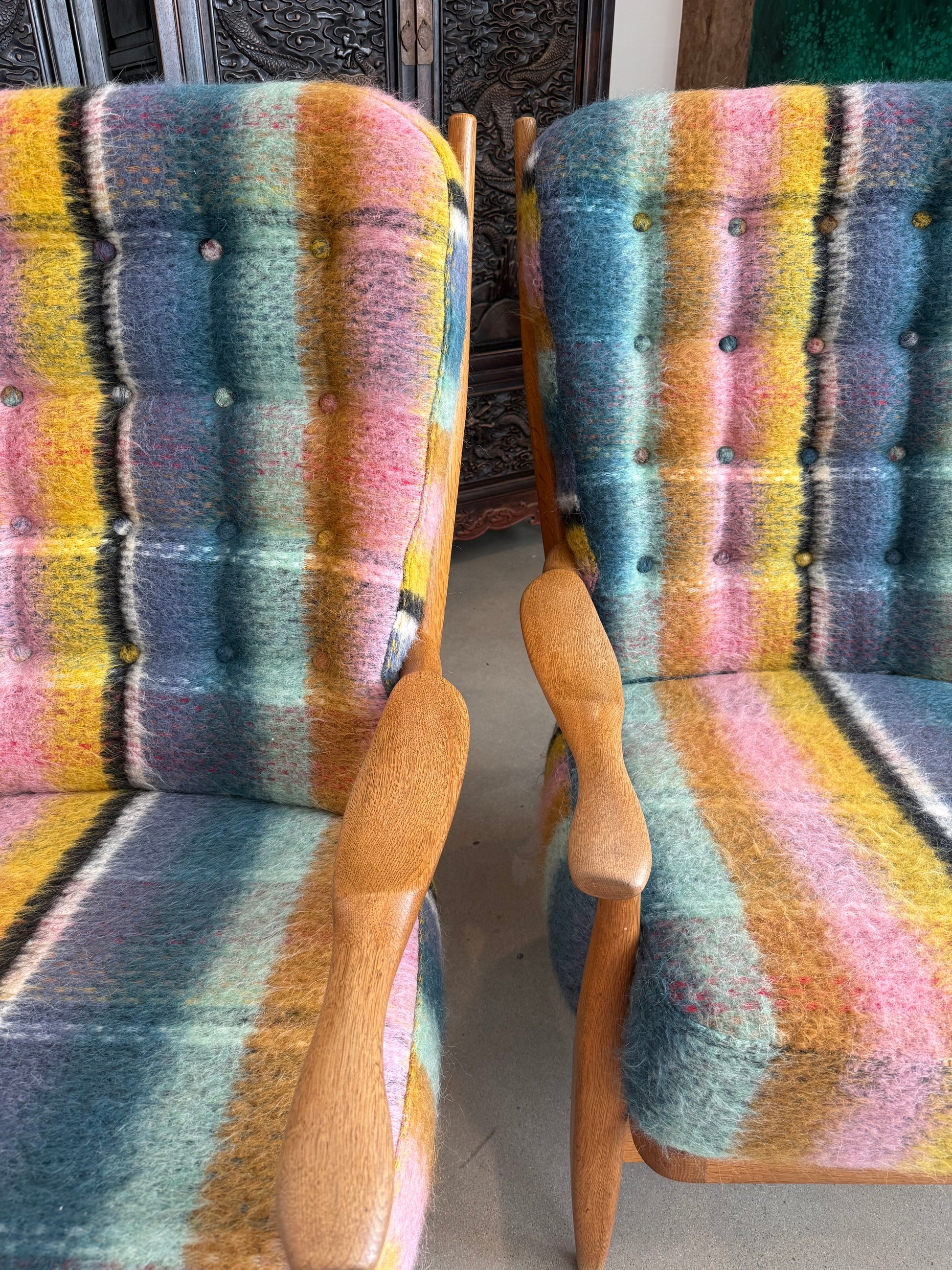 These Guillerme et Chambron ‘Grand Repos’ lounge chairs display a beautiful contrast between the light oak frame and the elegant Kneedler Fauchere fabric of the cushions.