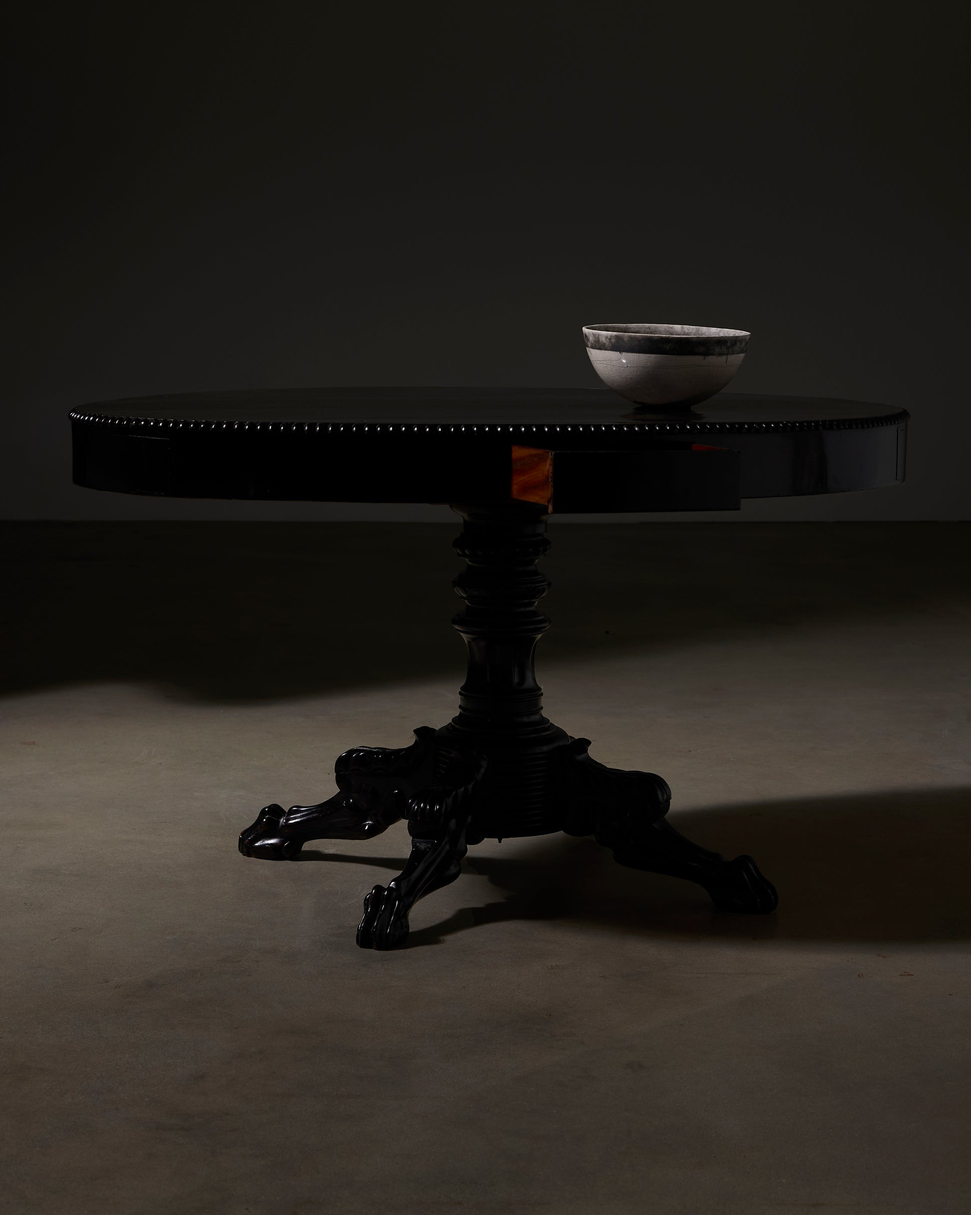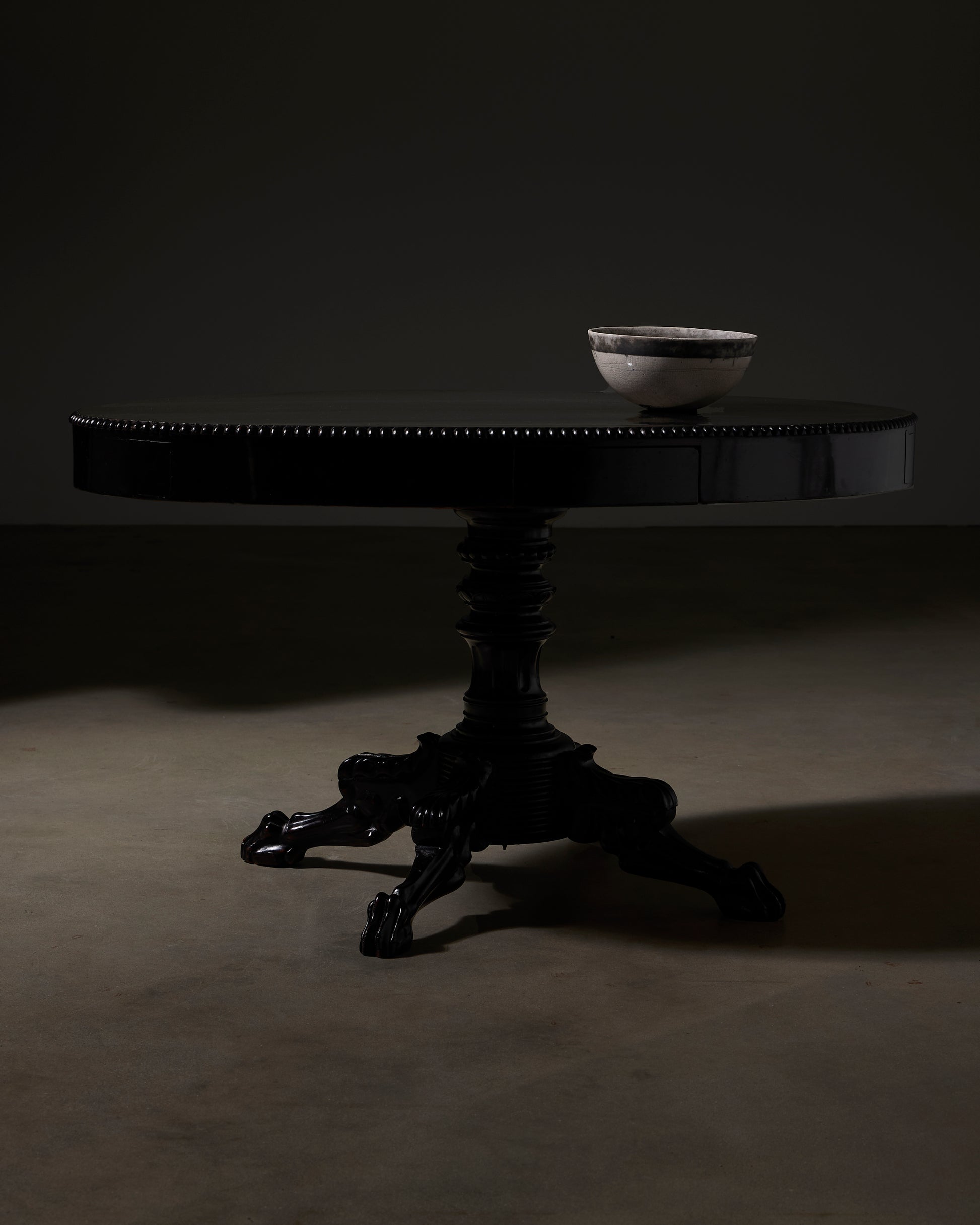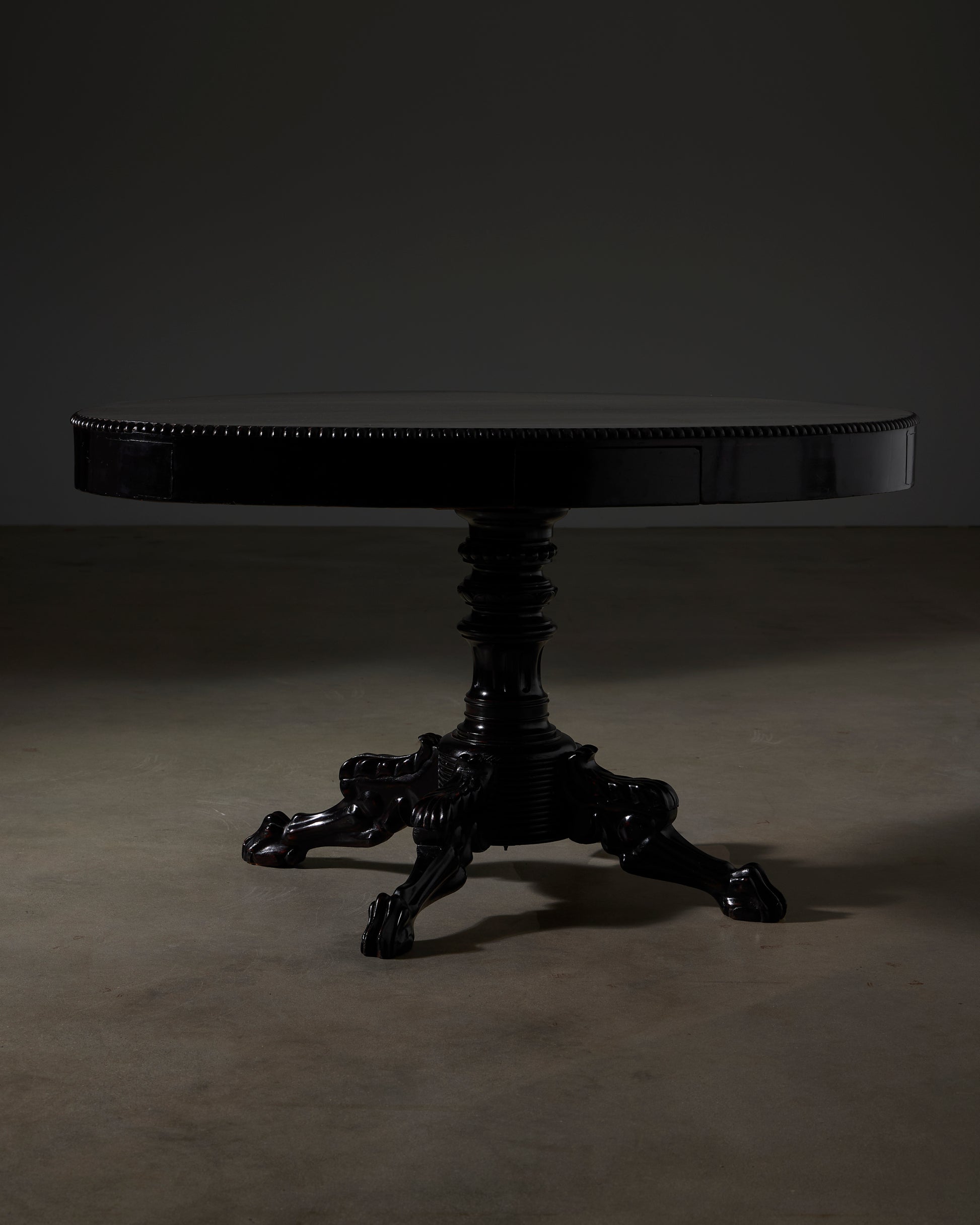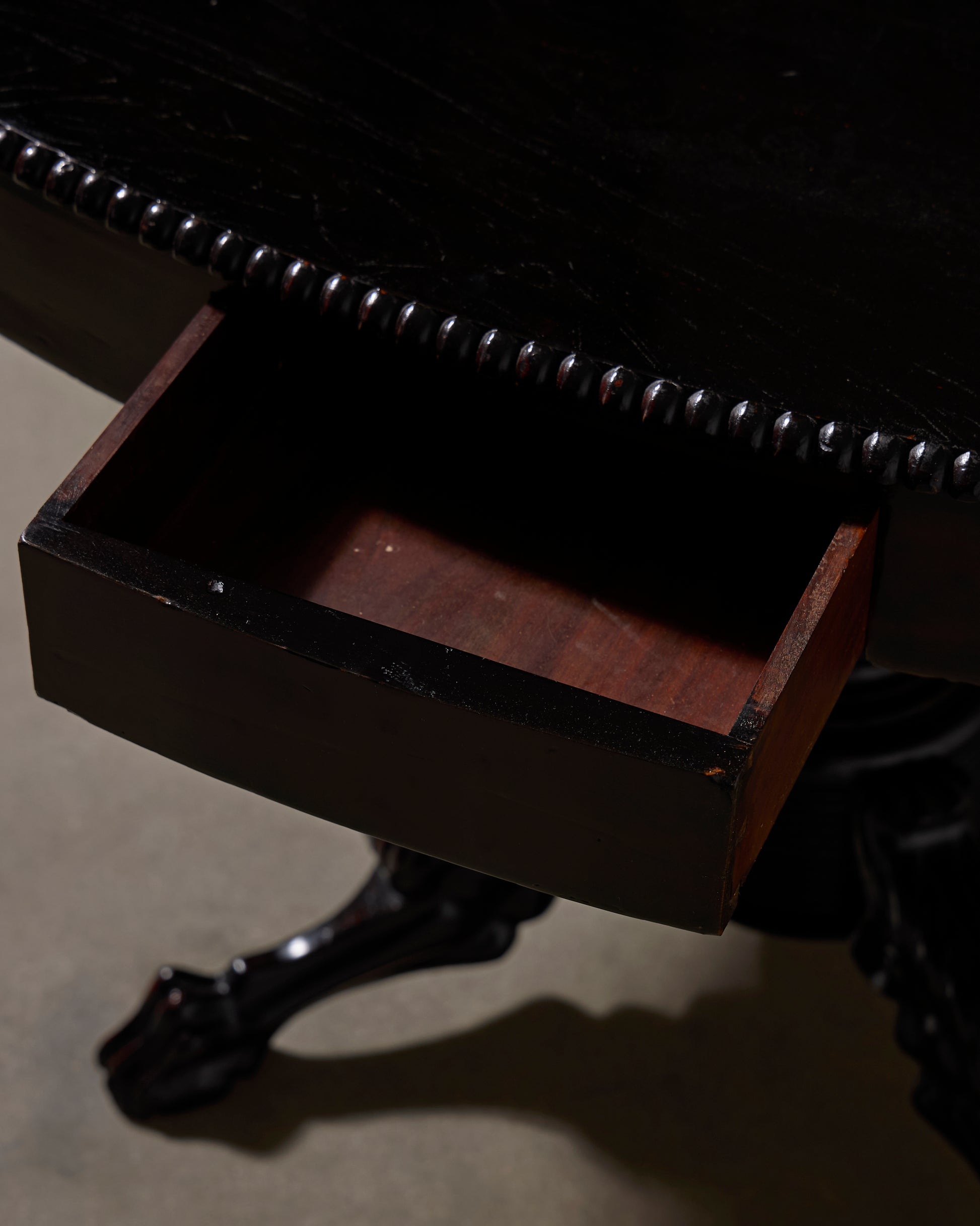 This vintage ebonized pedestal coffee table features a round top with beaded trim and a base with carved claw feet inspired by 19th-century Regency style. A hidden drawer adds a practical touch to its timeless design.