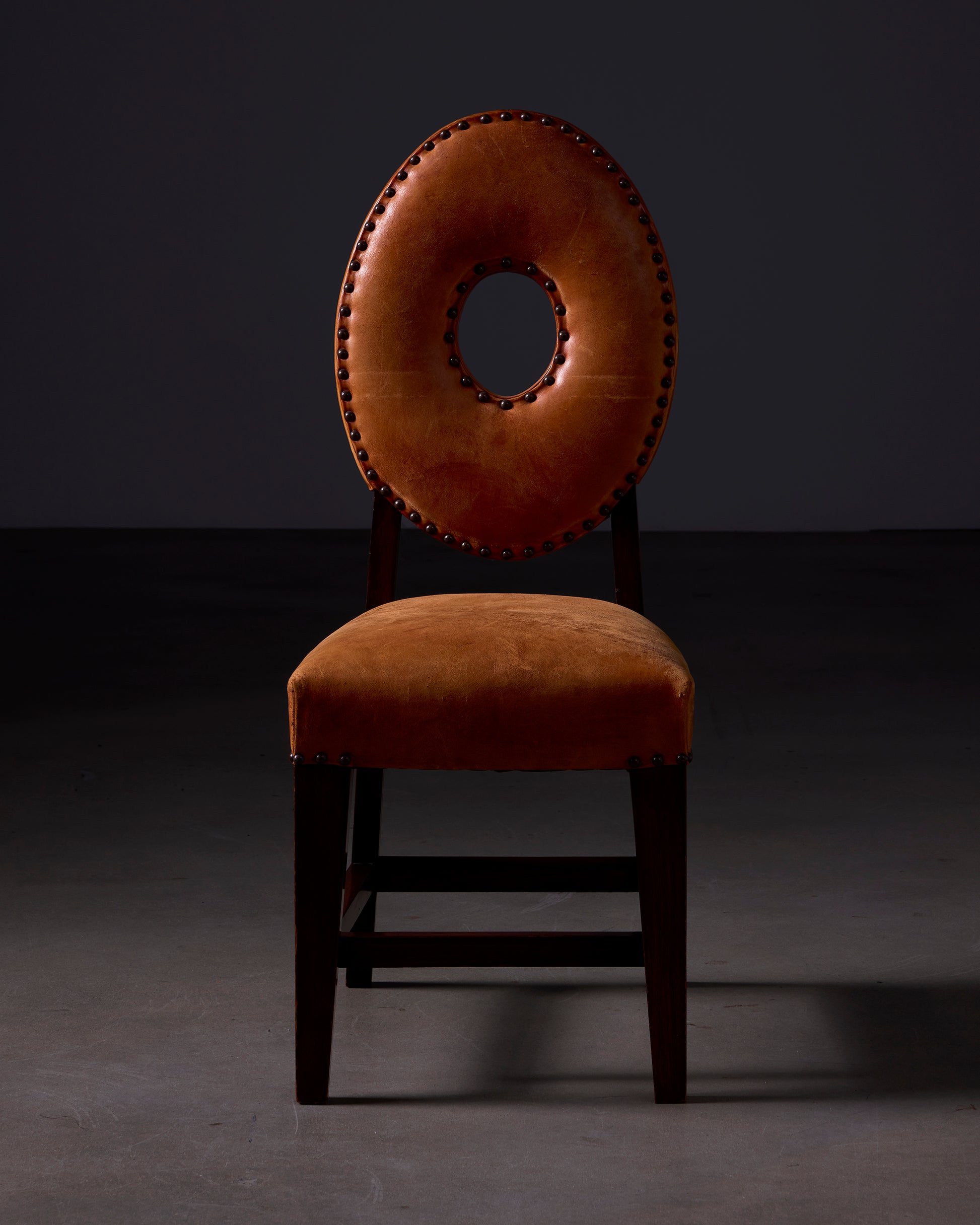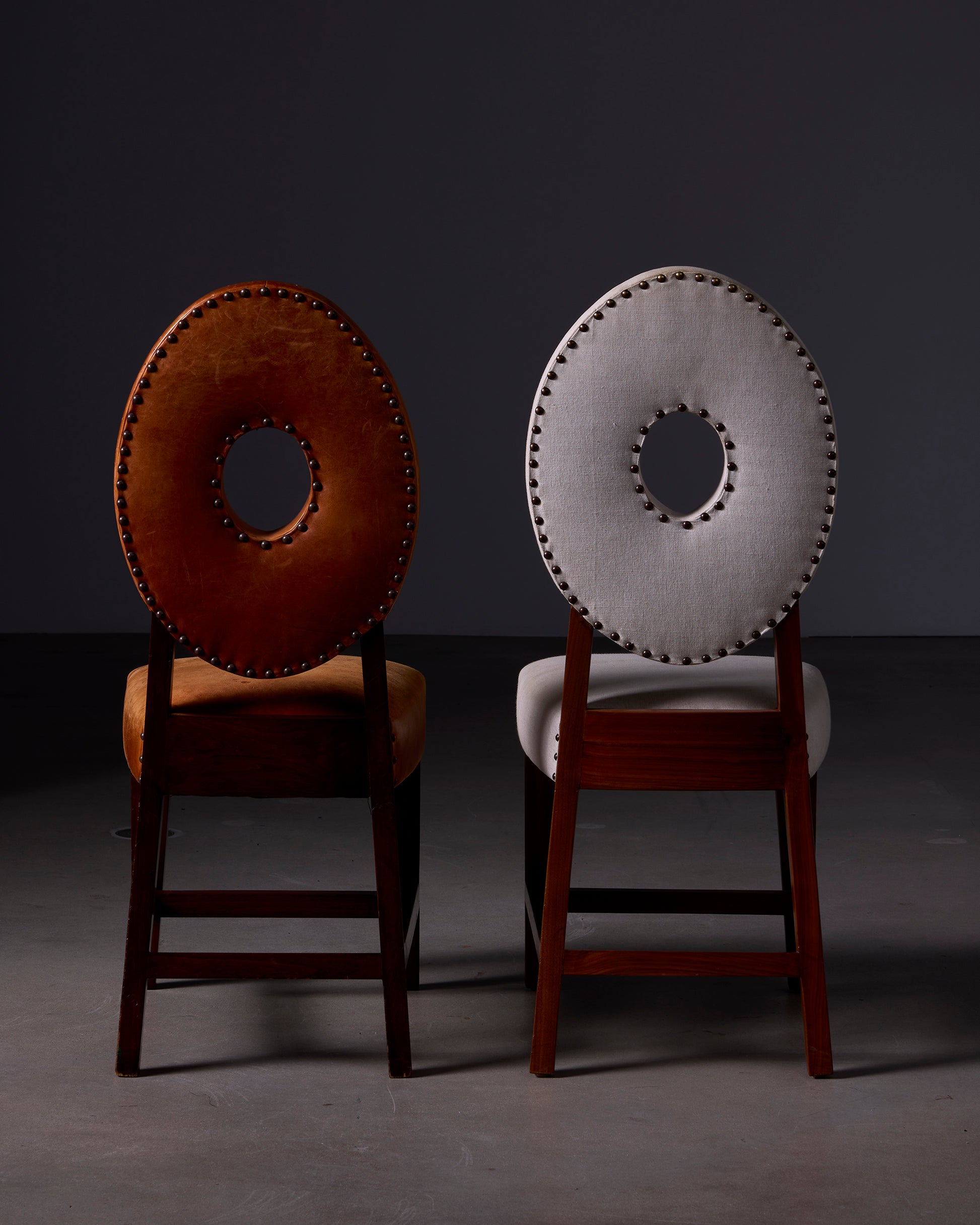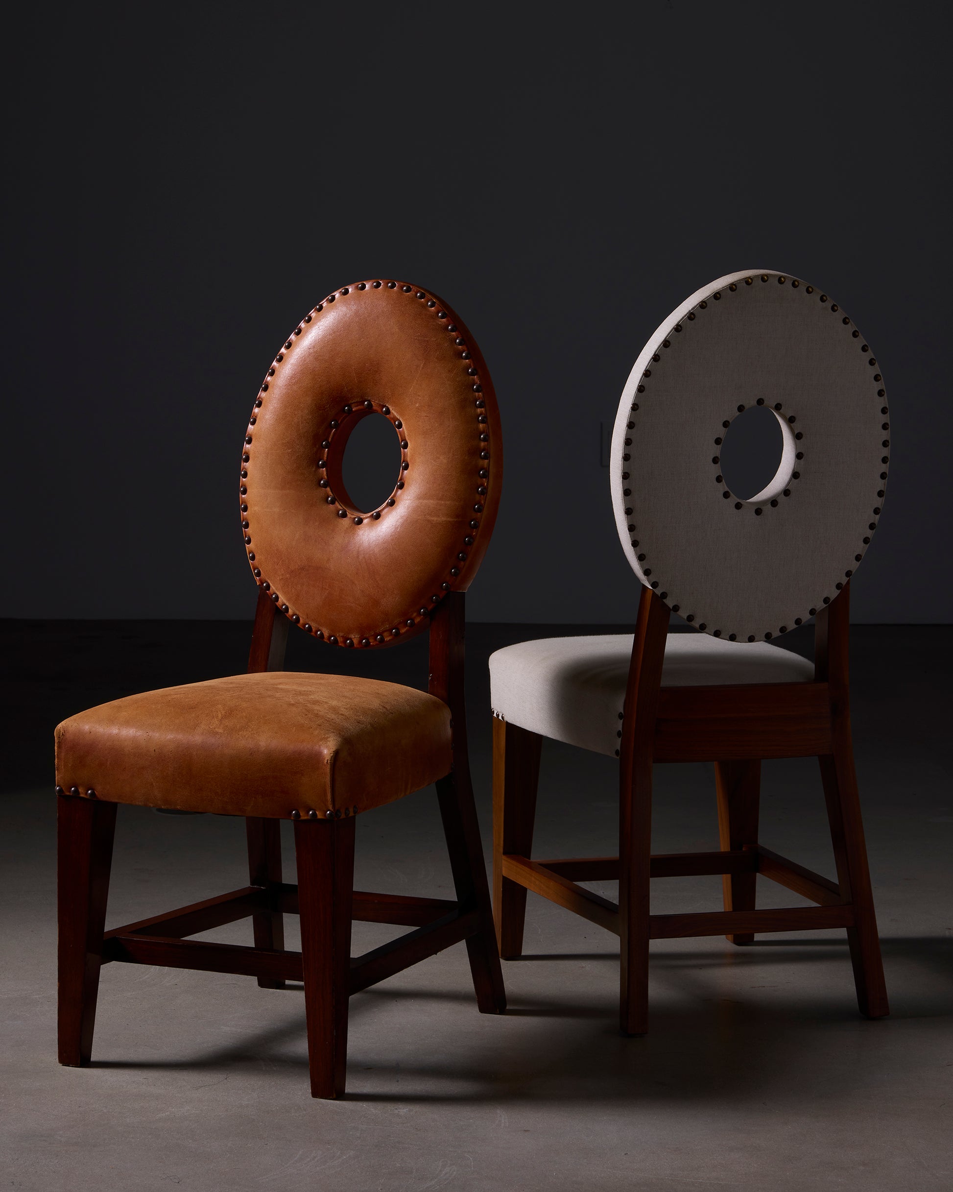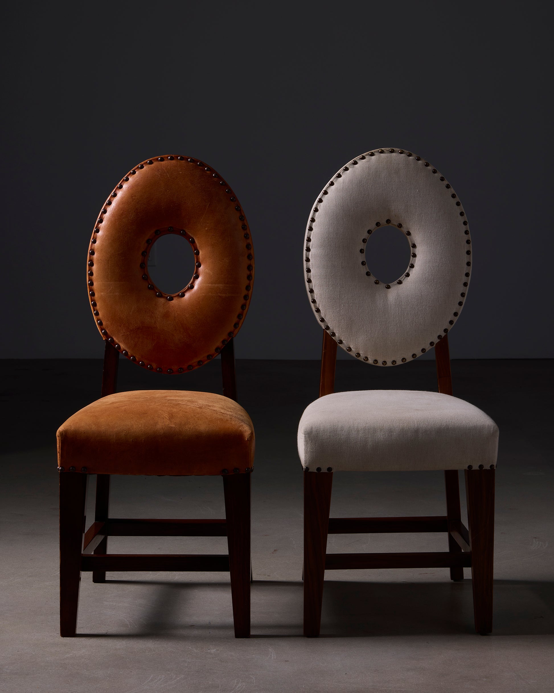 Oval Back Dining Chair in Natural Linen Antique Brass Nail.