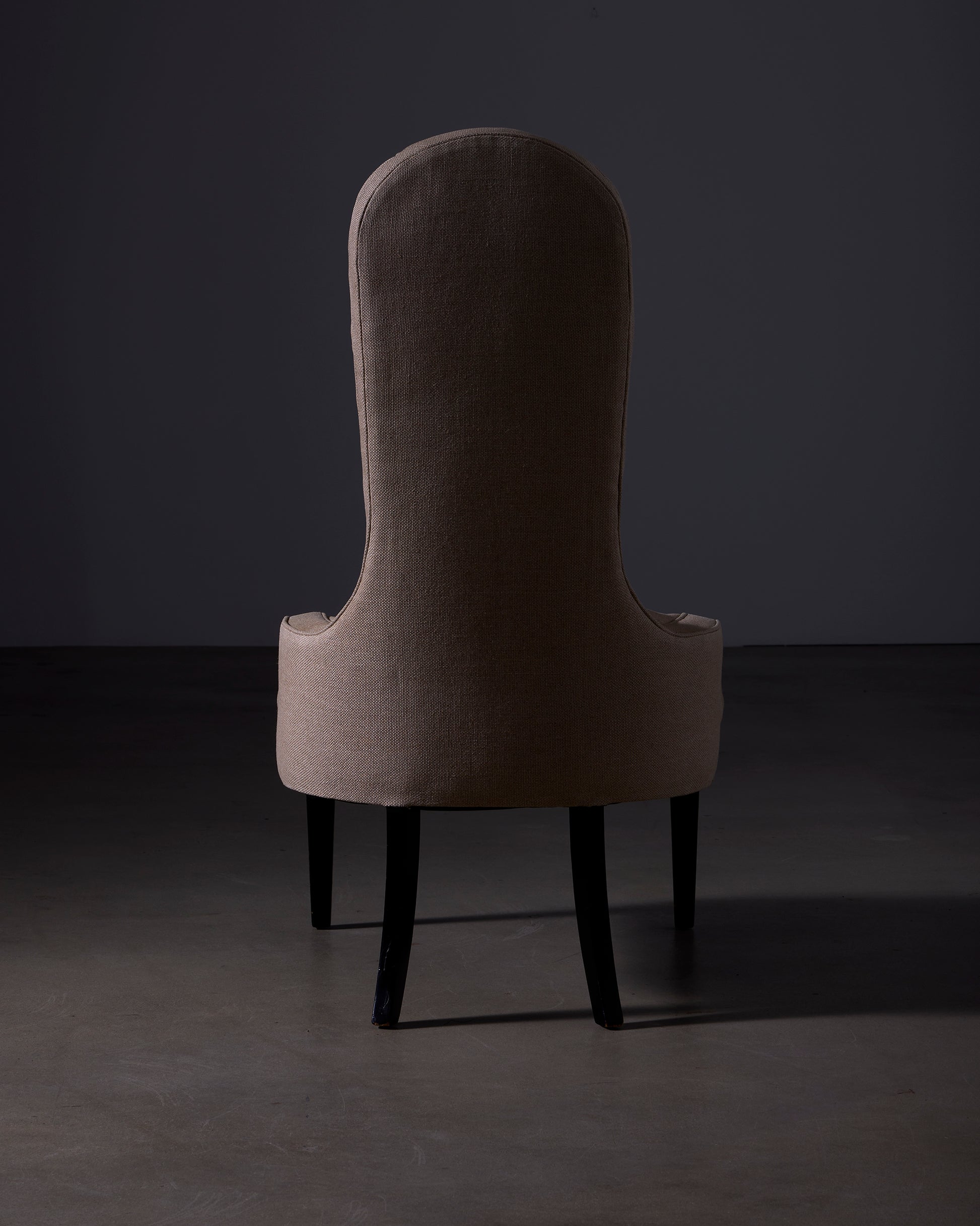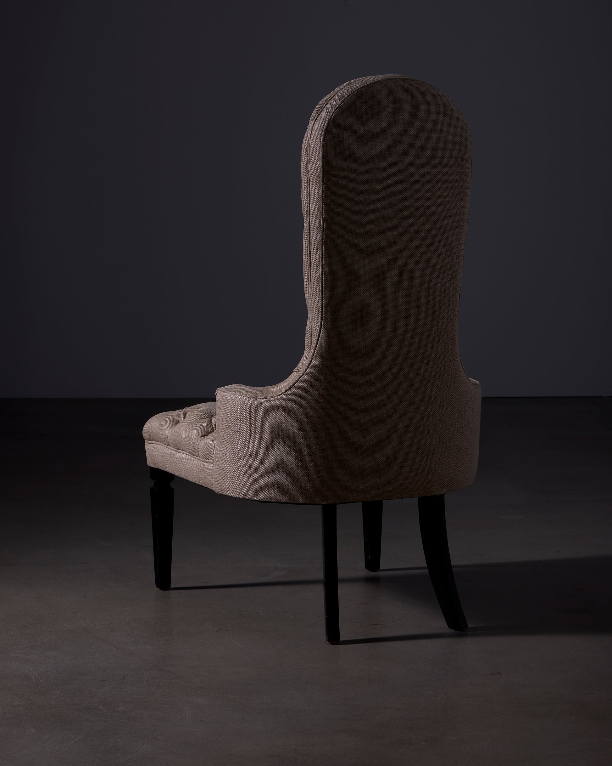 Button tufted upholstered chair in Natural Linen with ebonized leg.