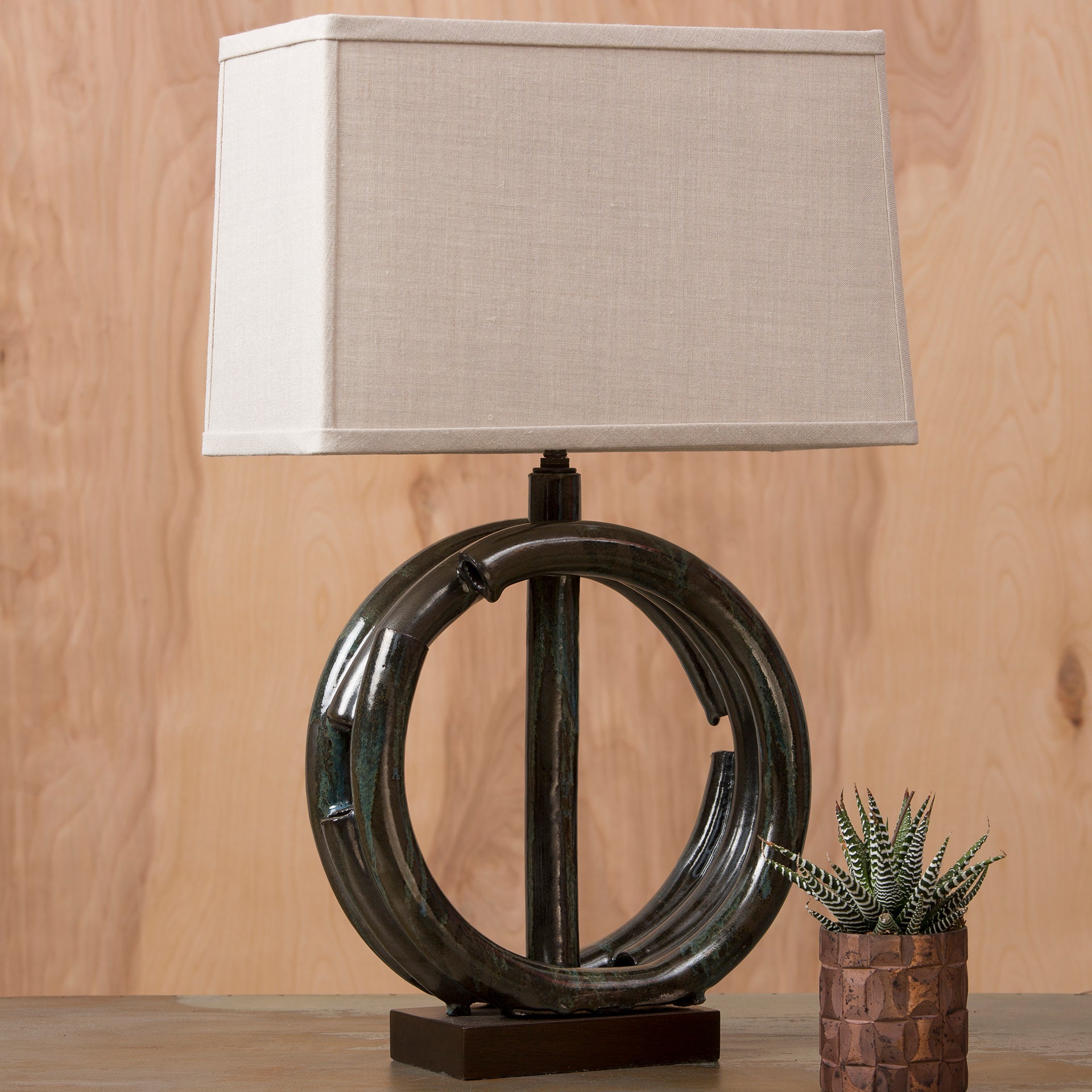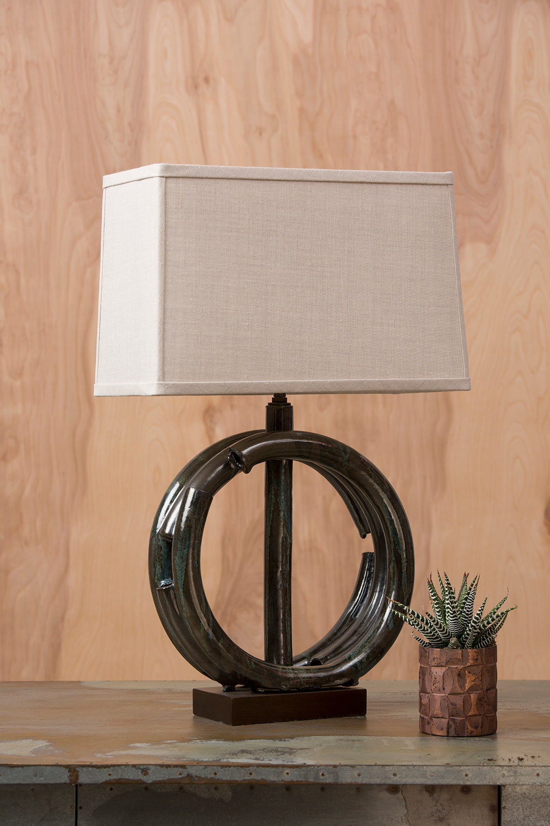 Materials: Hand-built glazed stoneware, stained wood base, custom rectangle natural linen shade. As Shown: White clay body with matte black glaze, dark stained walnut base Various finishes, glazes and shades available