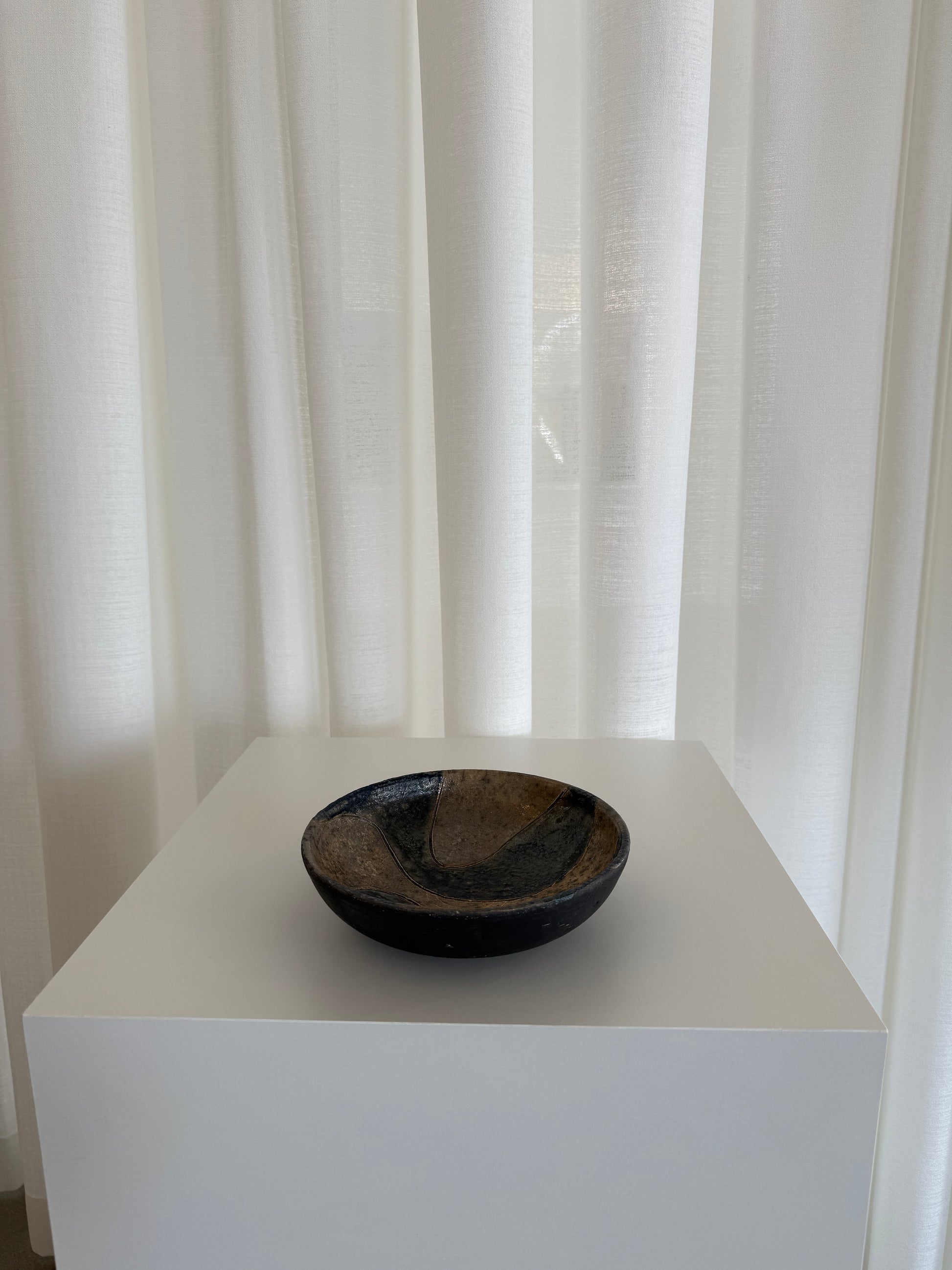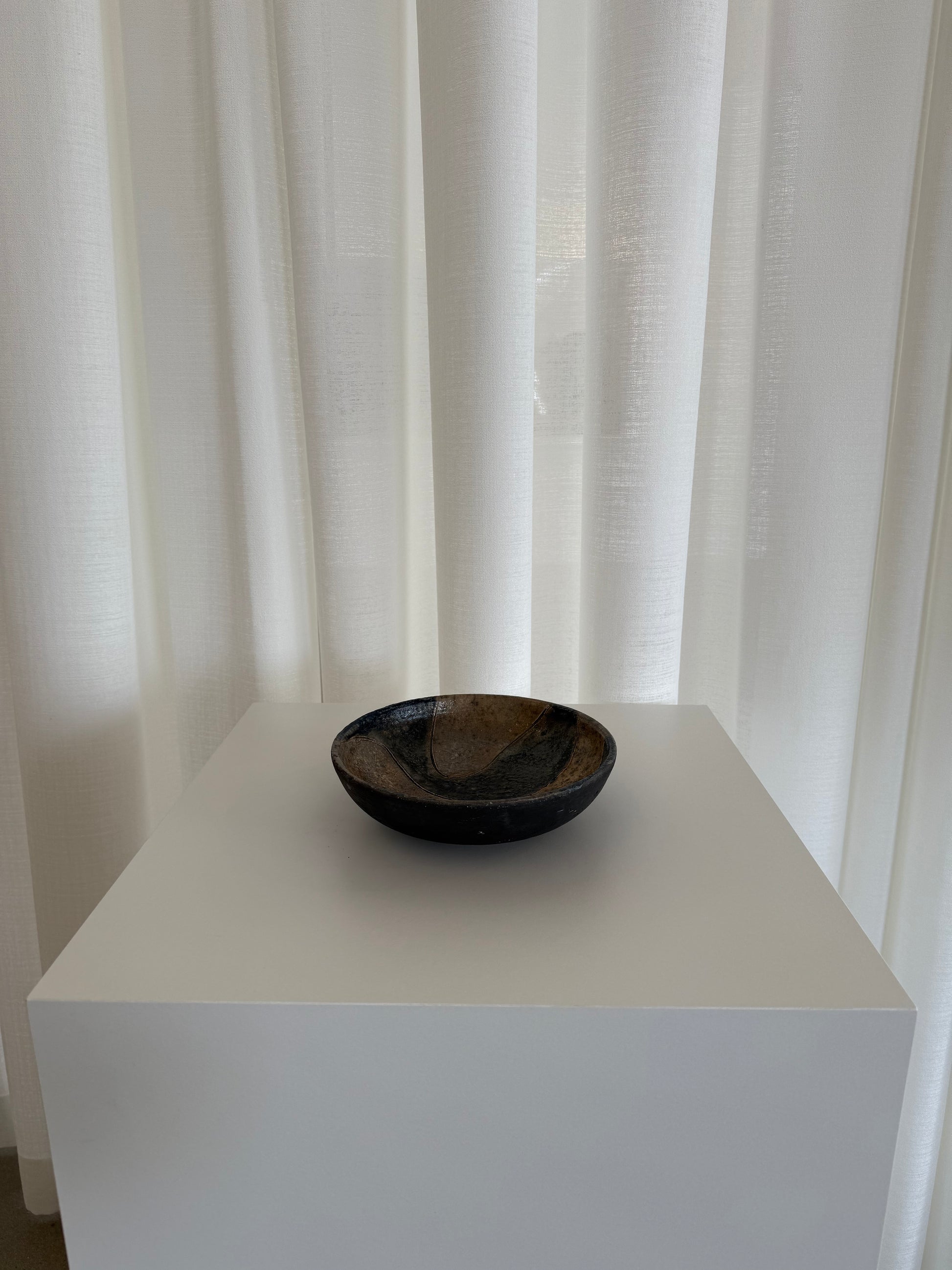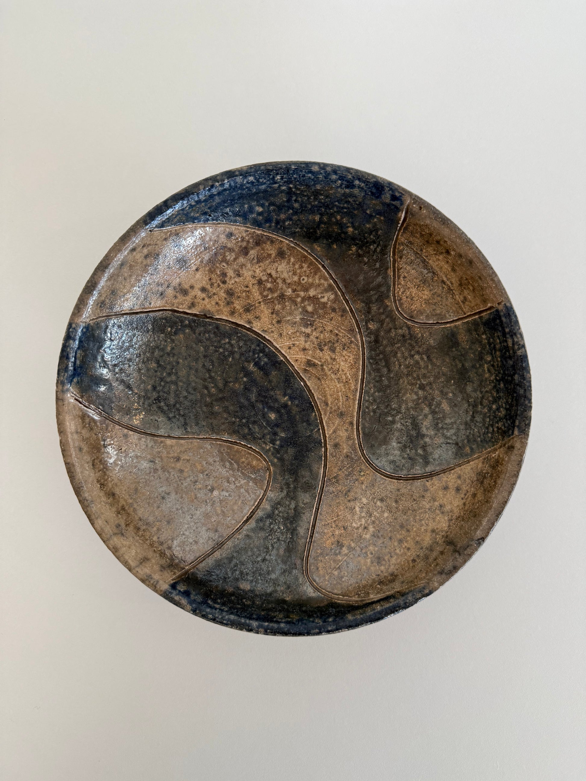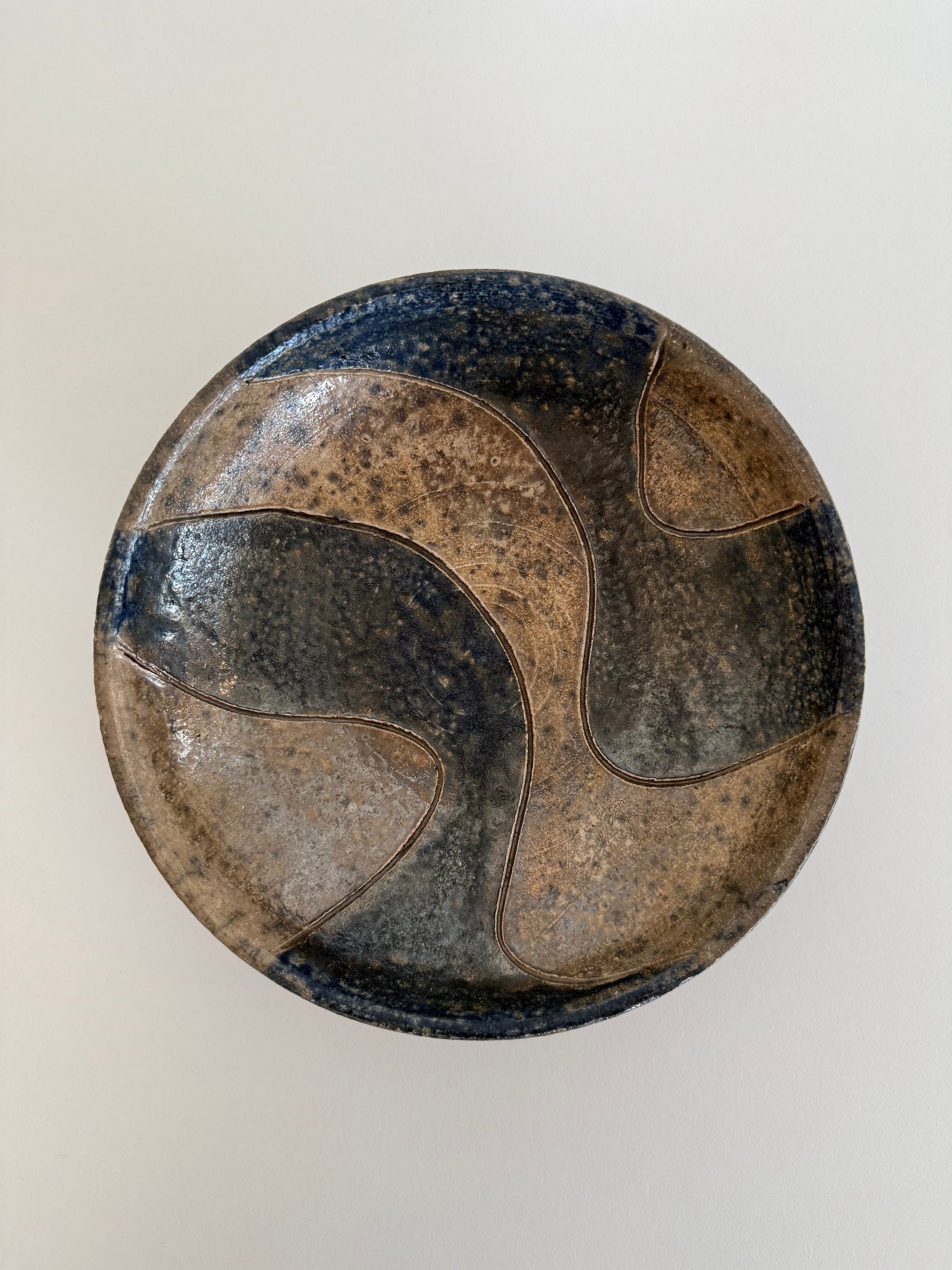 Ruku Studio Pottery Bowl with woodchip tan and dark blue glaze.