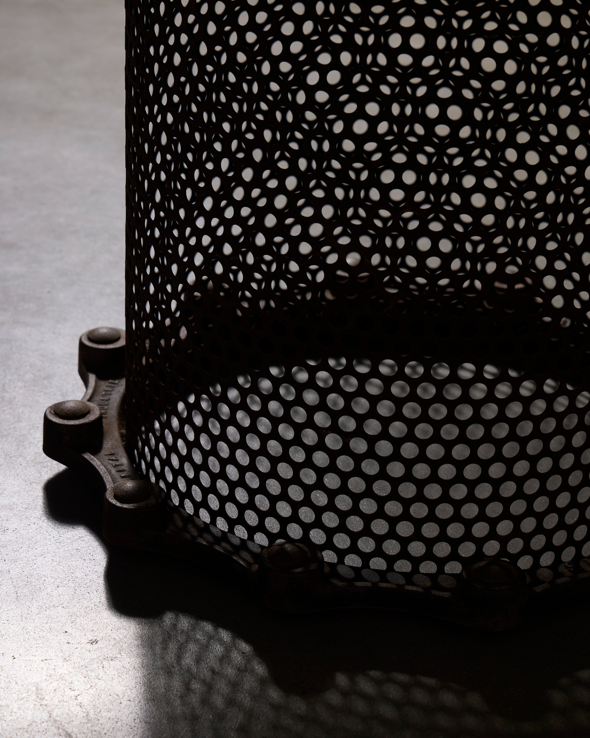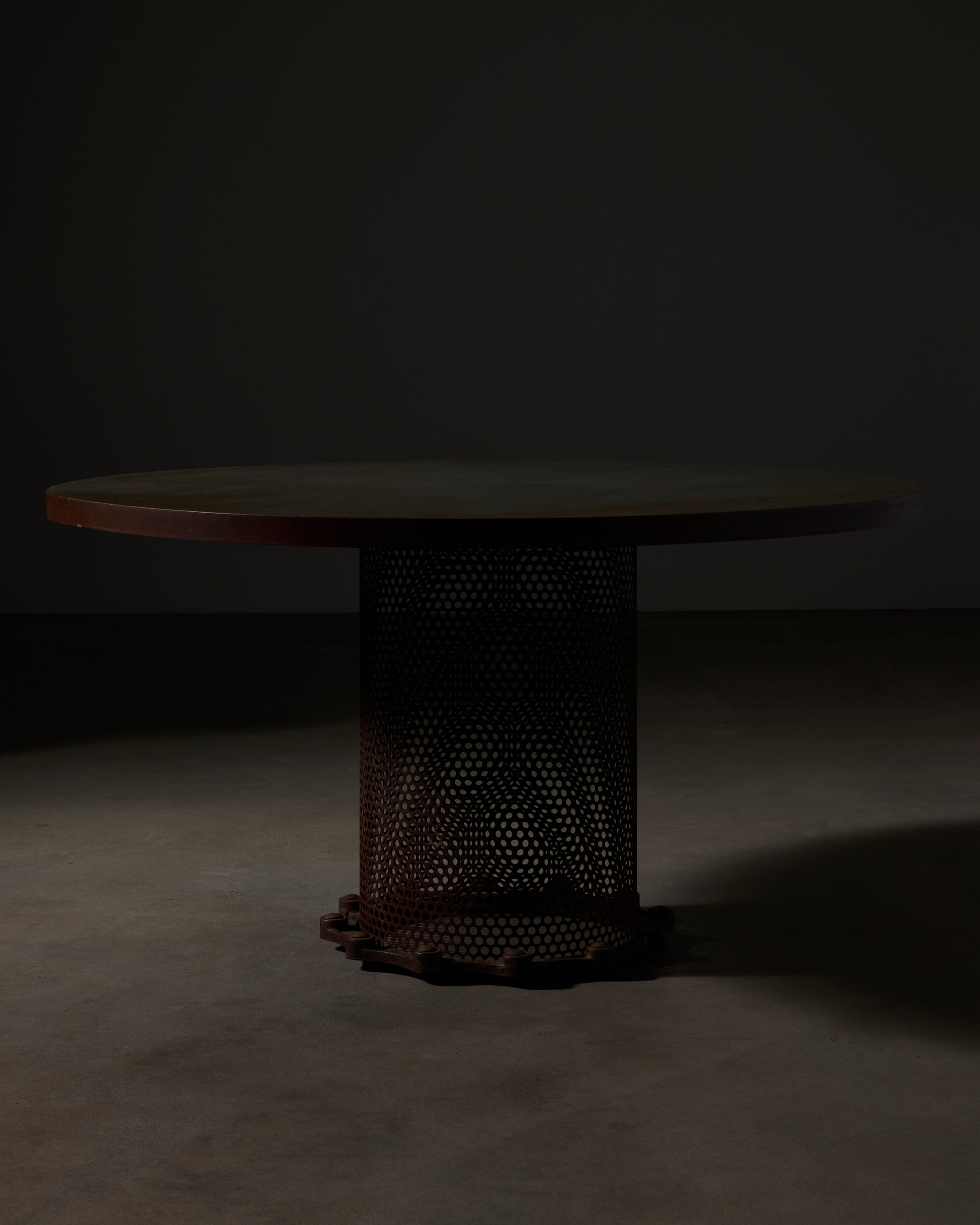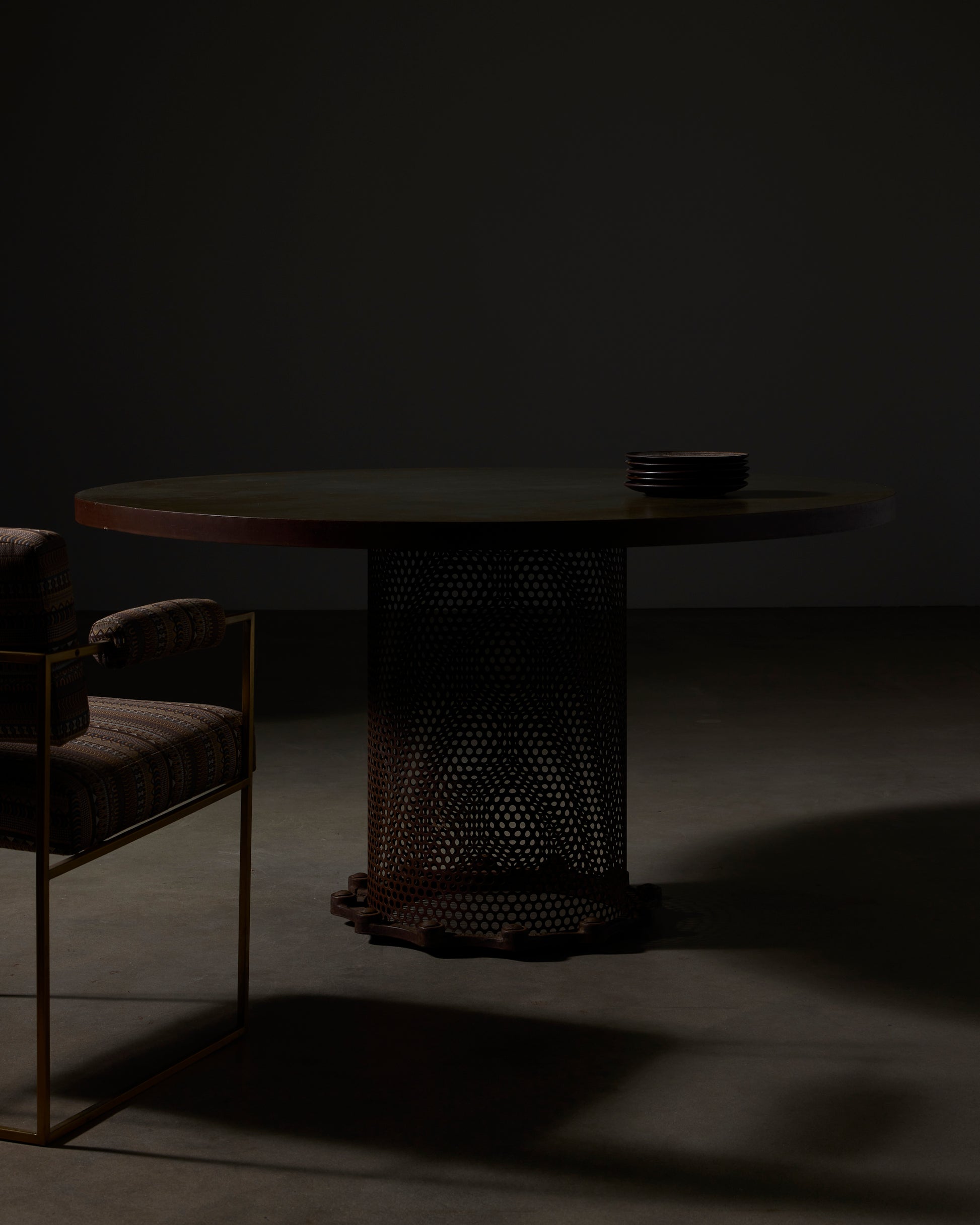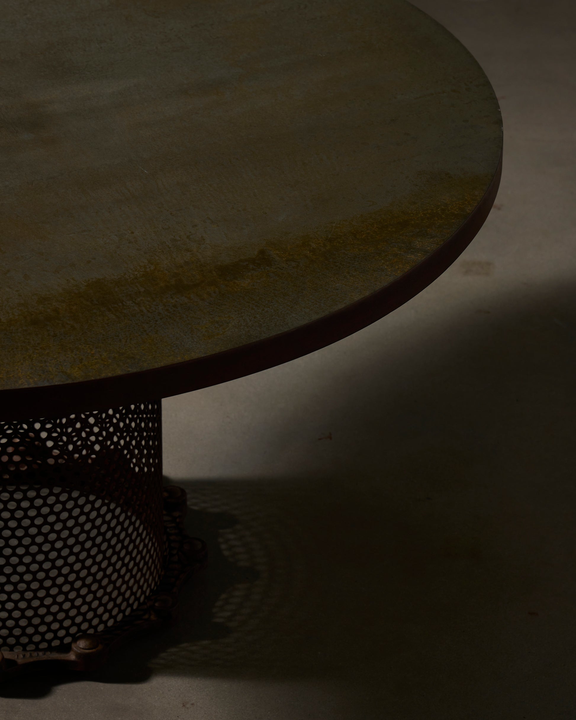 Crafted entirely from reclaimed steel, this round table features a smooth, weathered steel top paired with a perforated steel base. The bottom creates a striking contrast to the clean lines of the tabletop, offering a refined industrial statement. Ideal as a dining or entry table.