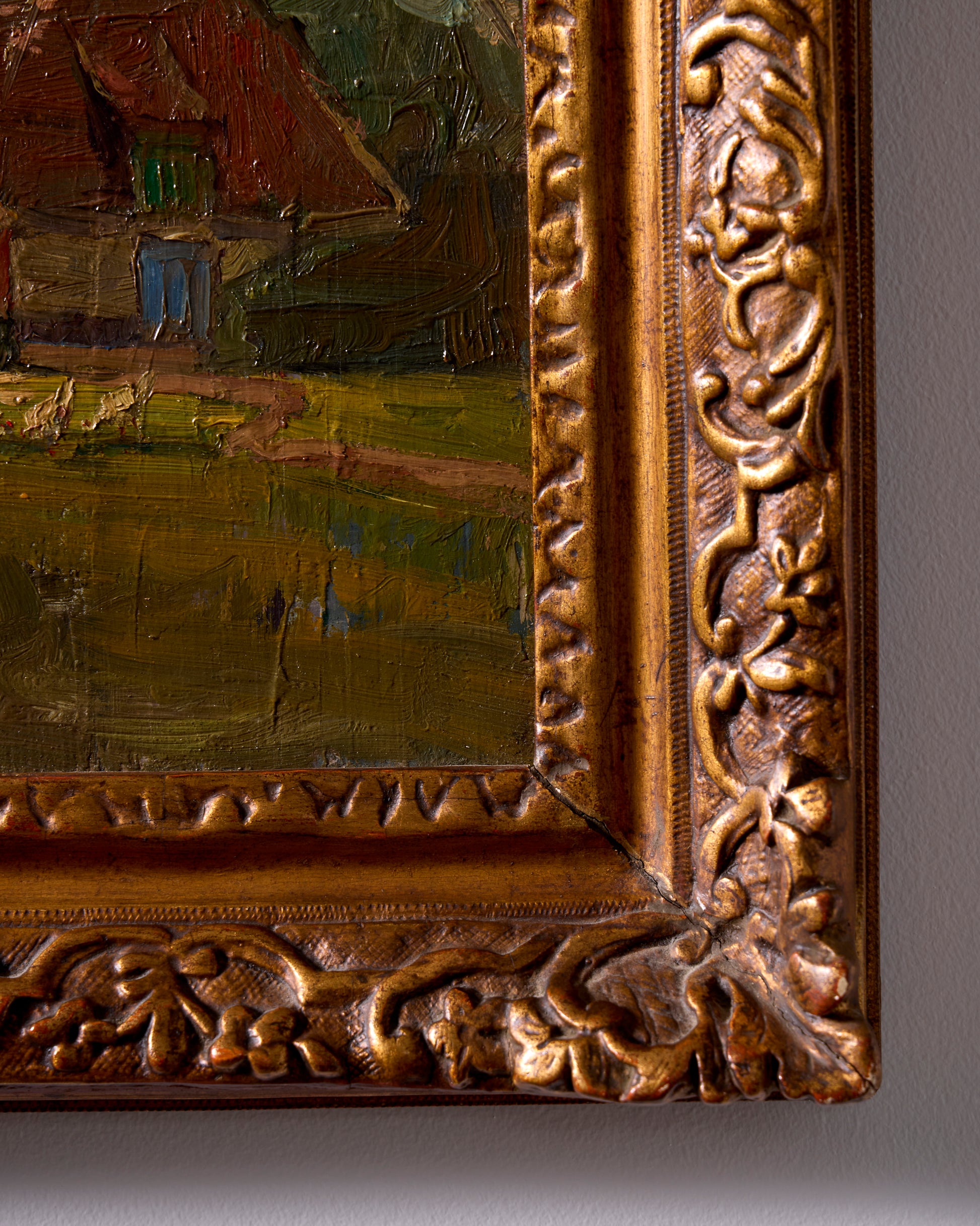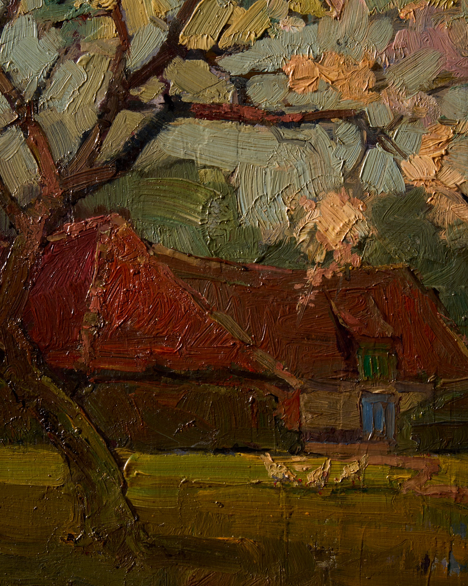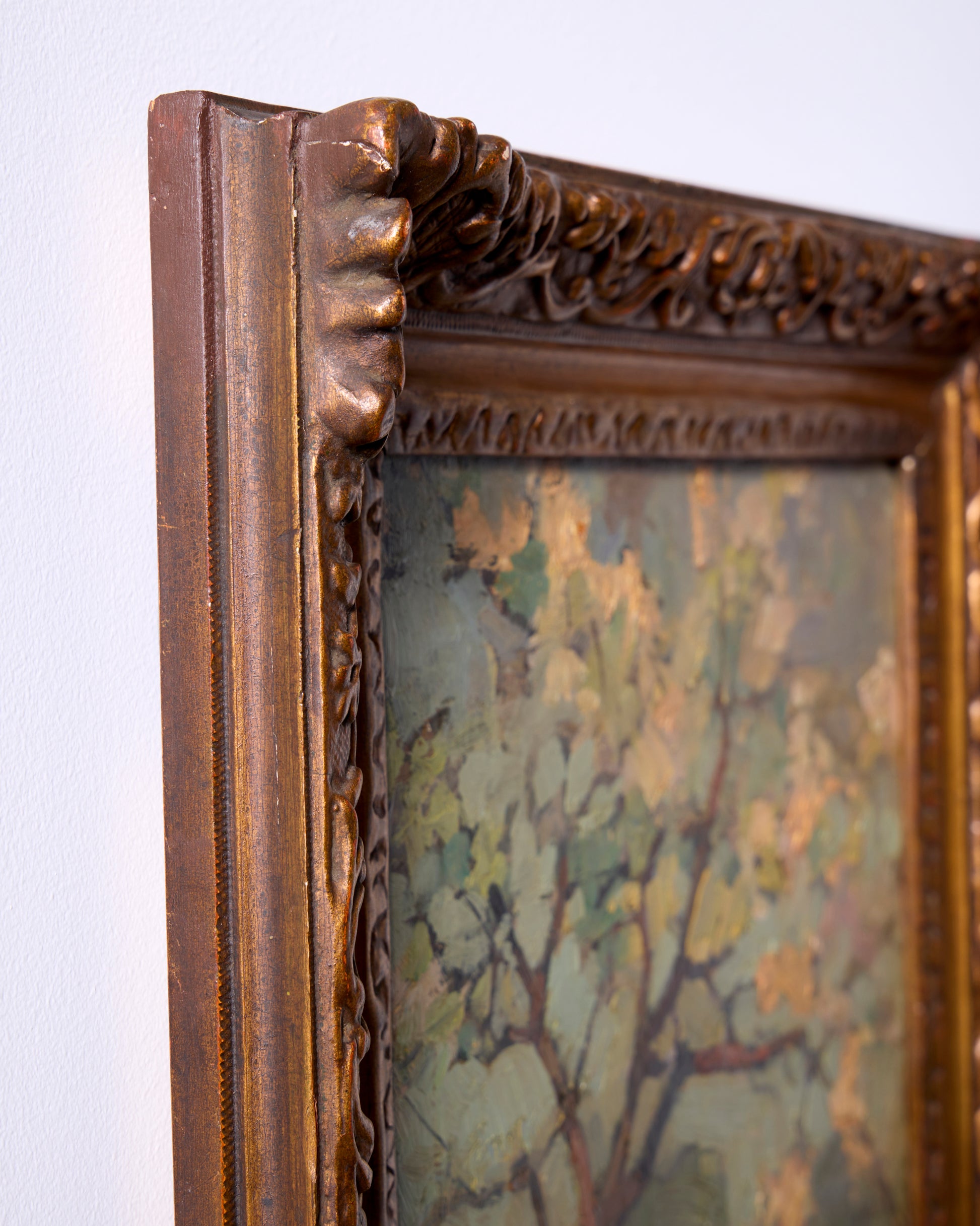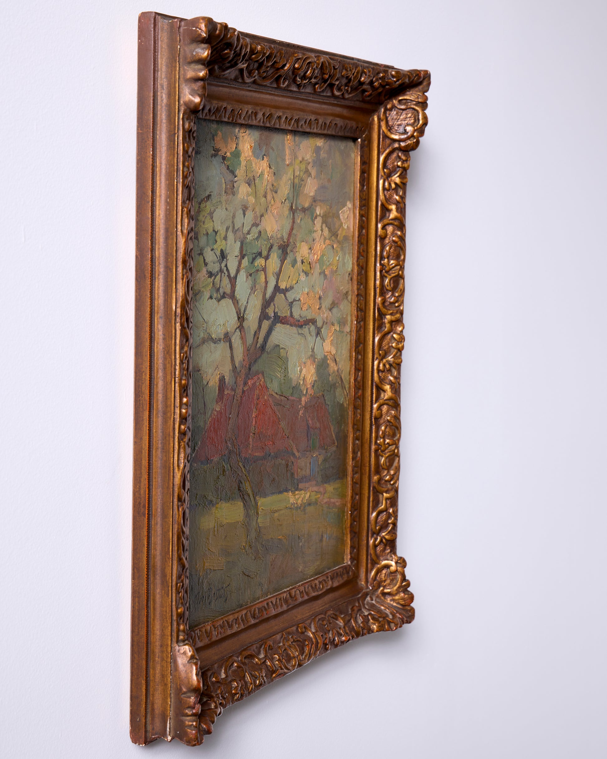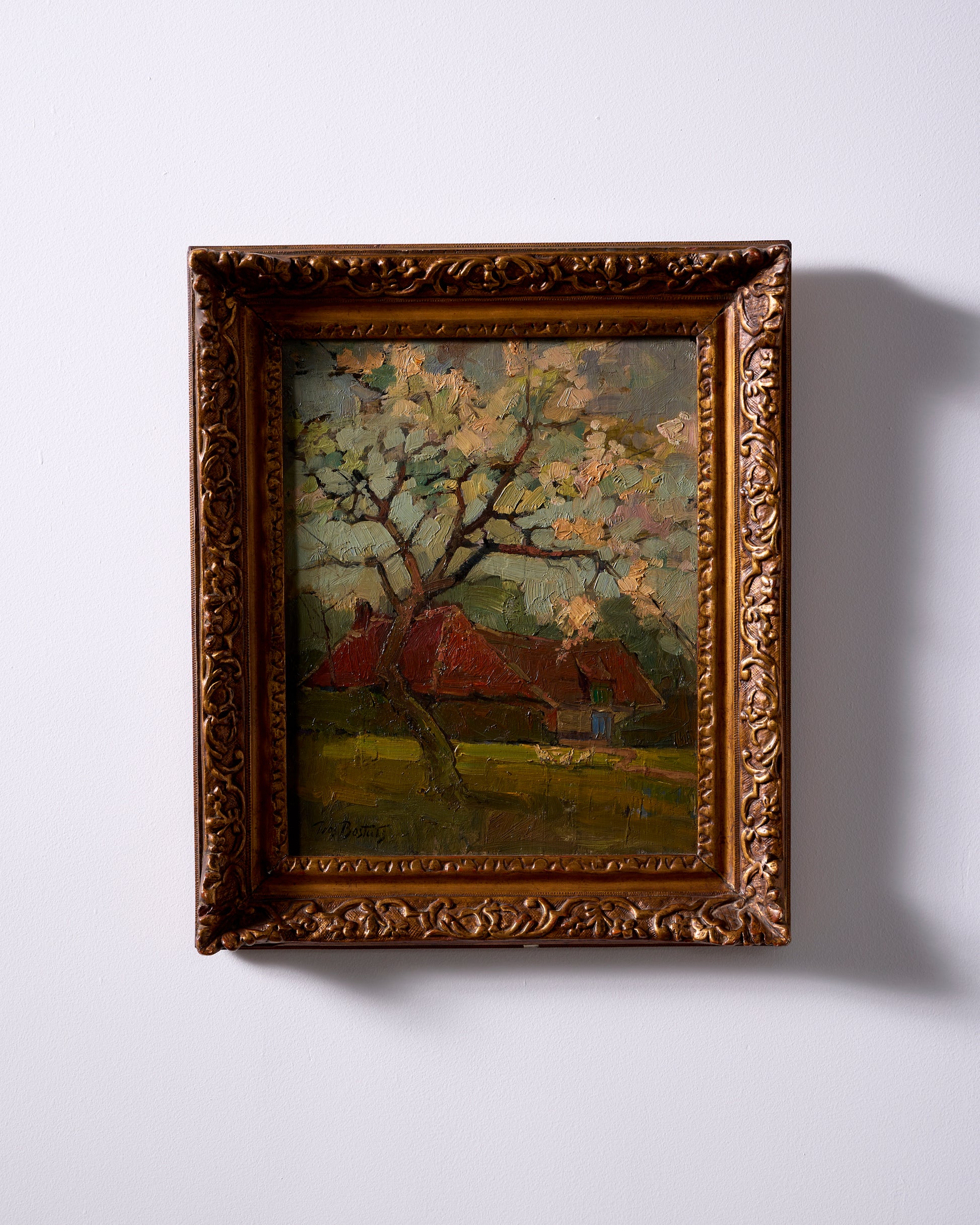 A richly textured oil painting depicting a blossoming tree in front of a rustic red-roofed cottage, framed in an ornate antique gold frame measuring 15" x 12".