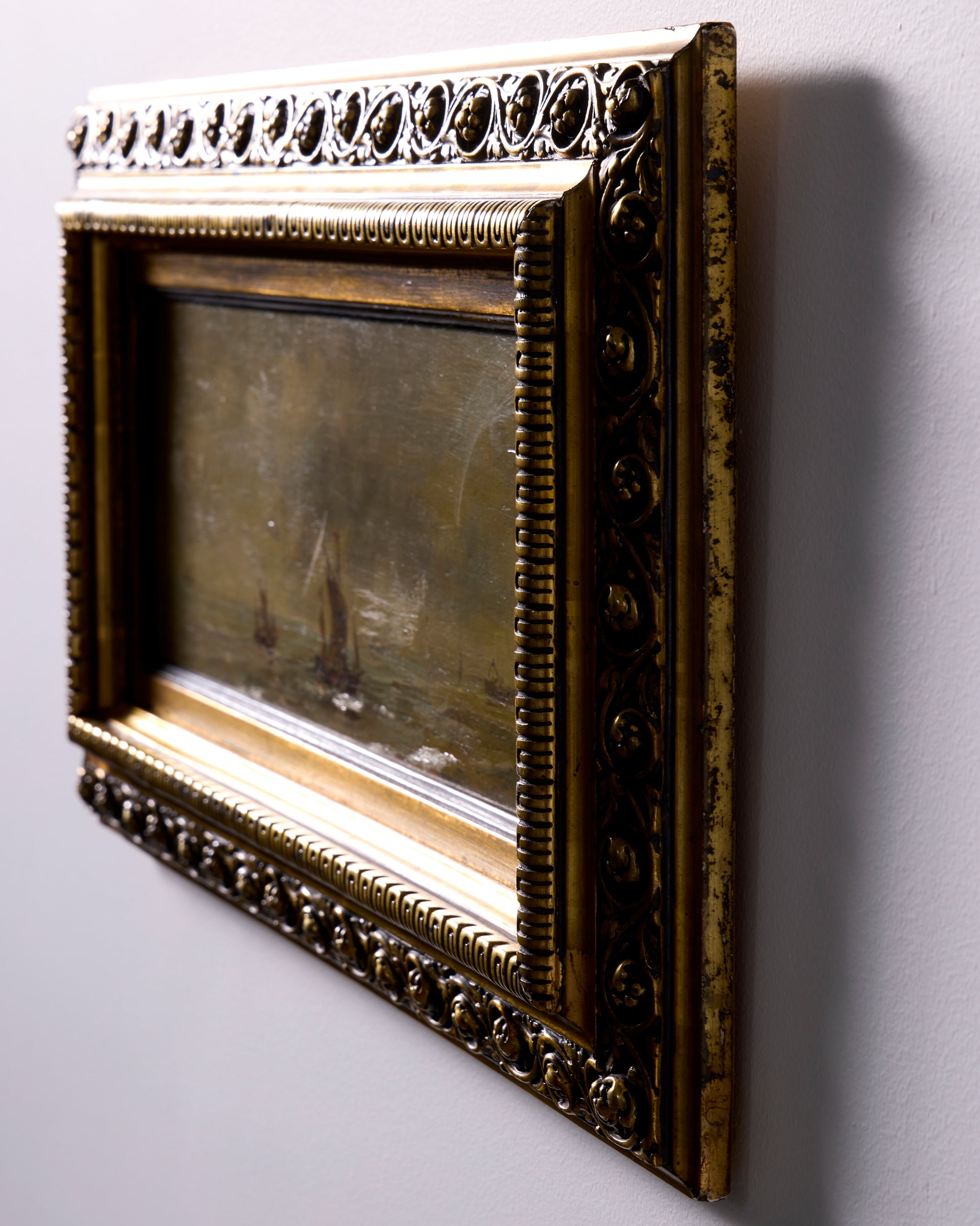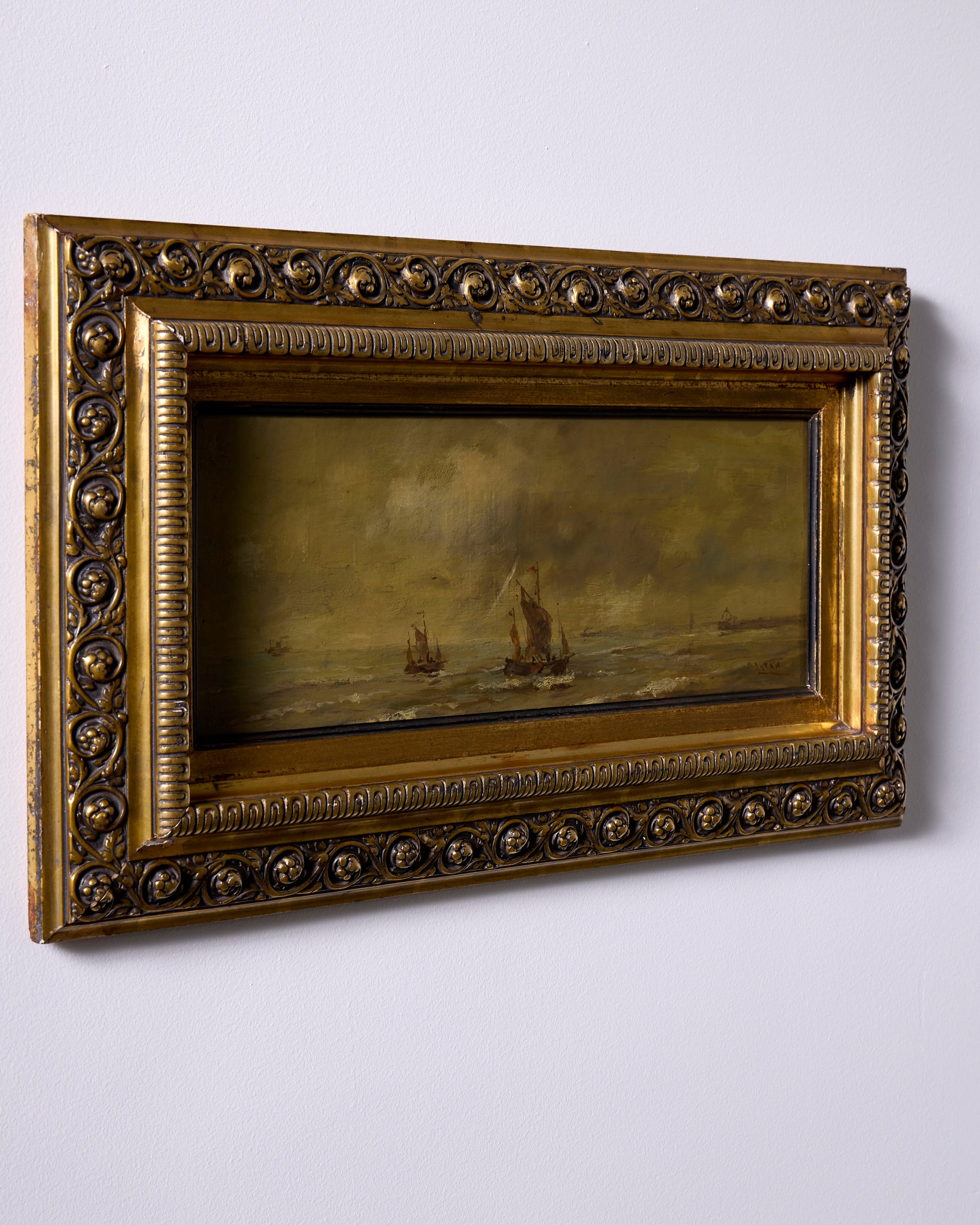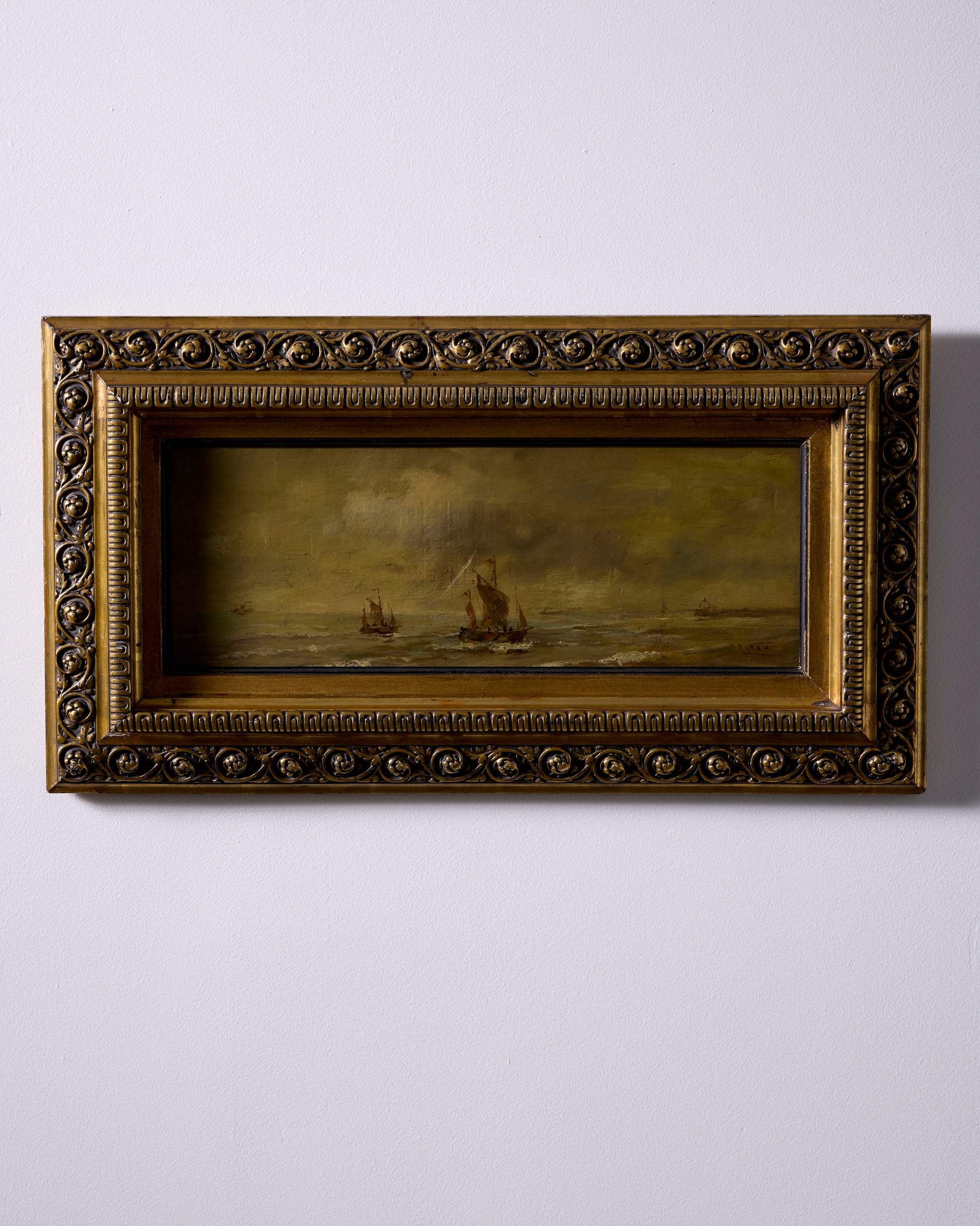"Extensive seascape with fishing boats", oil on panel & signed.