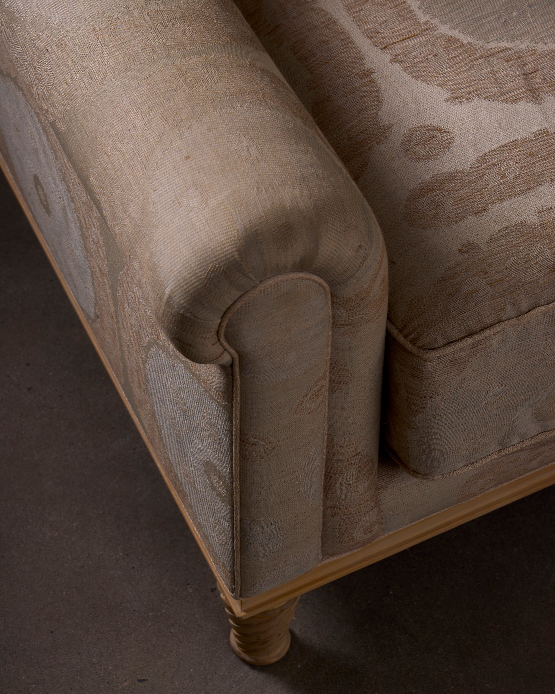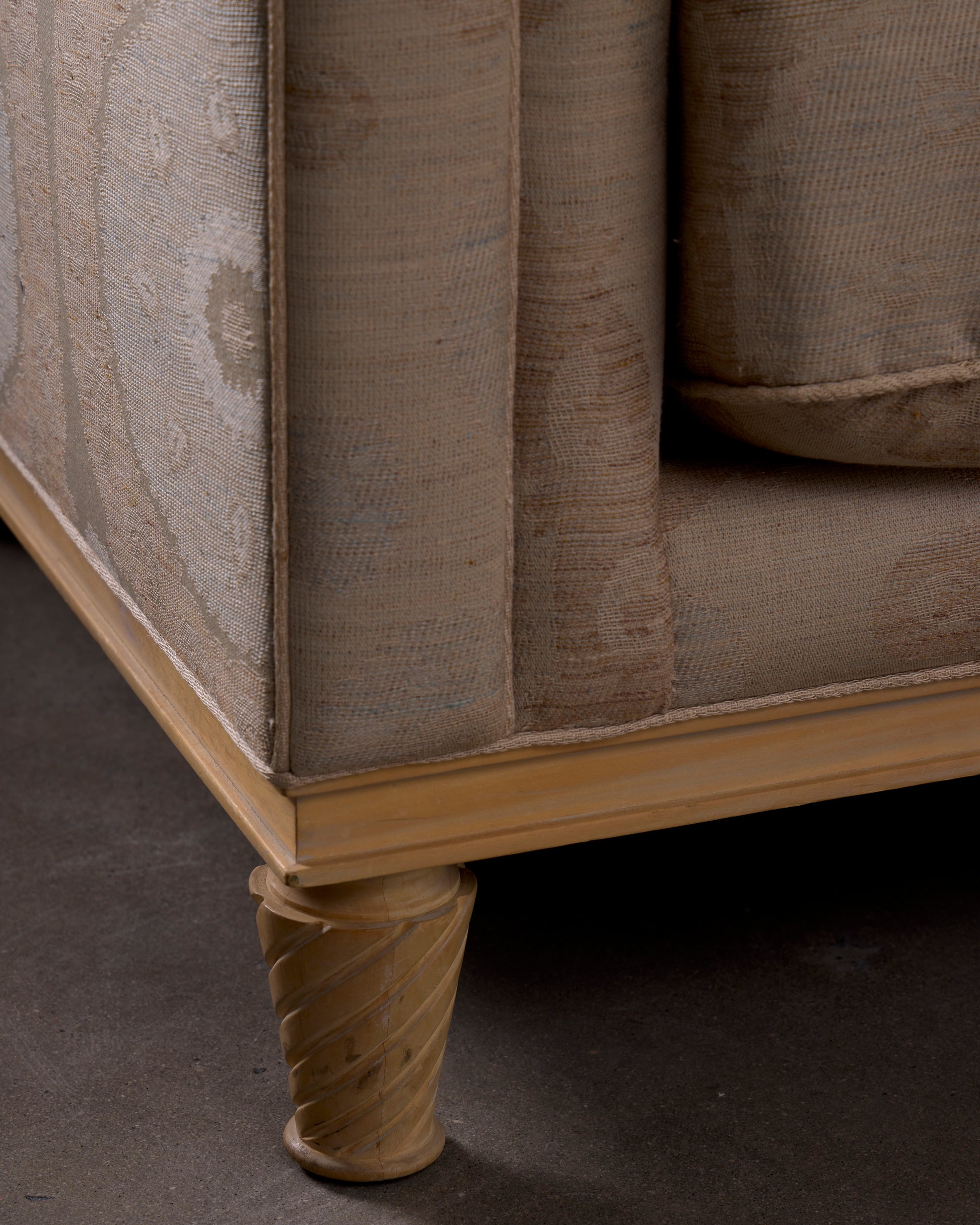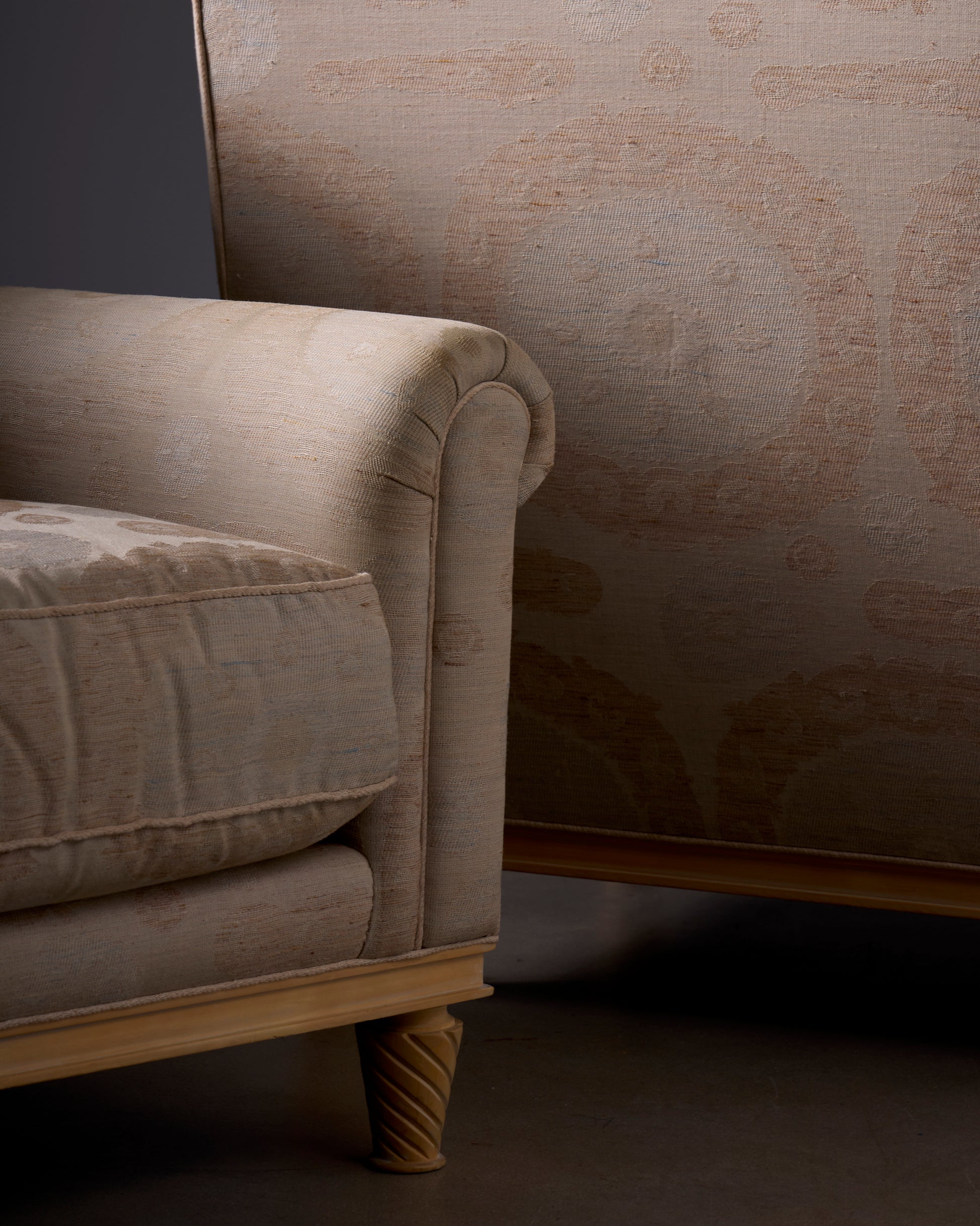 The Sand Dune Armchair is a stylish and comfortable upholstered chair. Round Oak base with craved twisted leg.