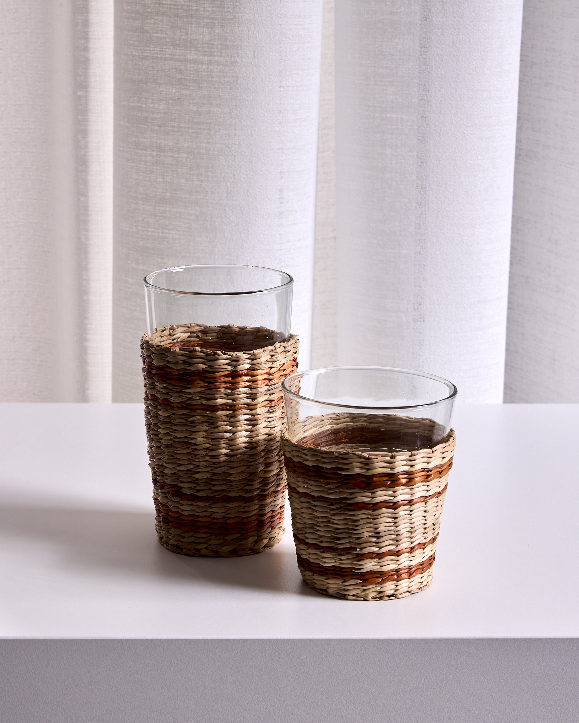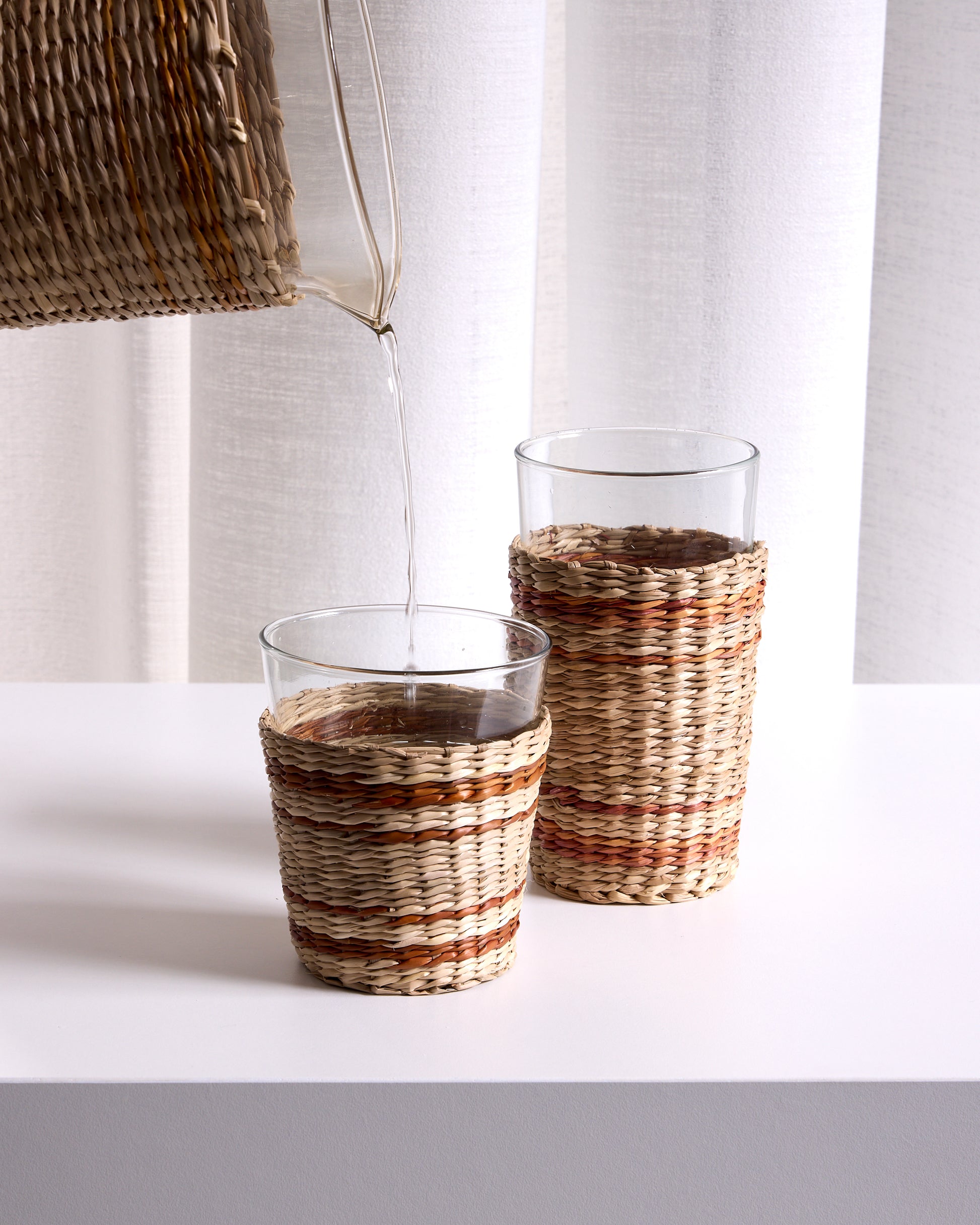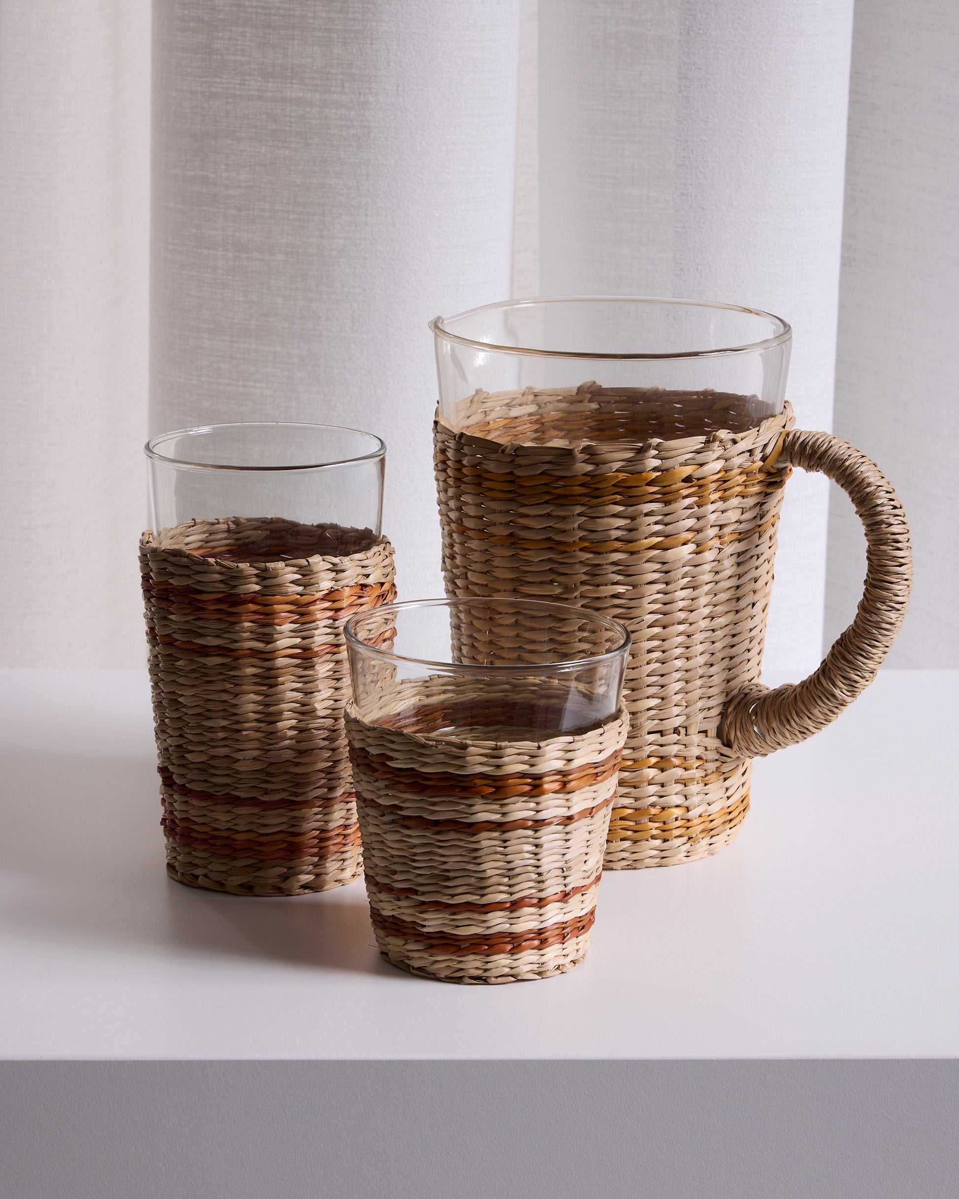 A natural seagrass wrapping of the Pitcher, Highball, and Tumbler. A festive piece for indoor or outdoor drinking & dining. Glass is dishwasher safe.