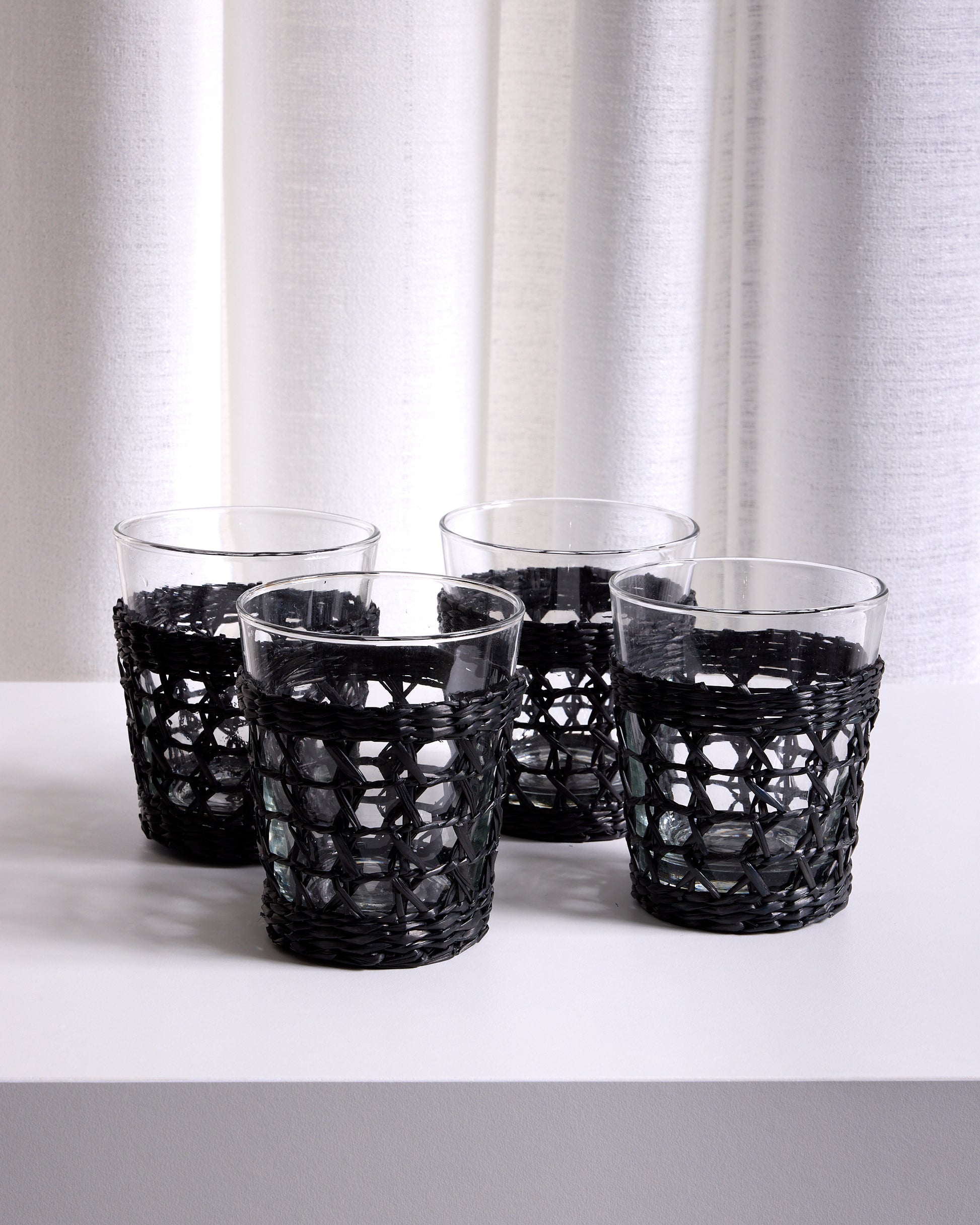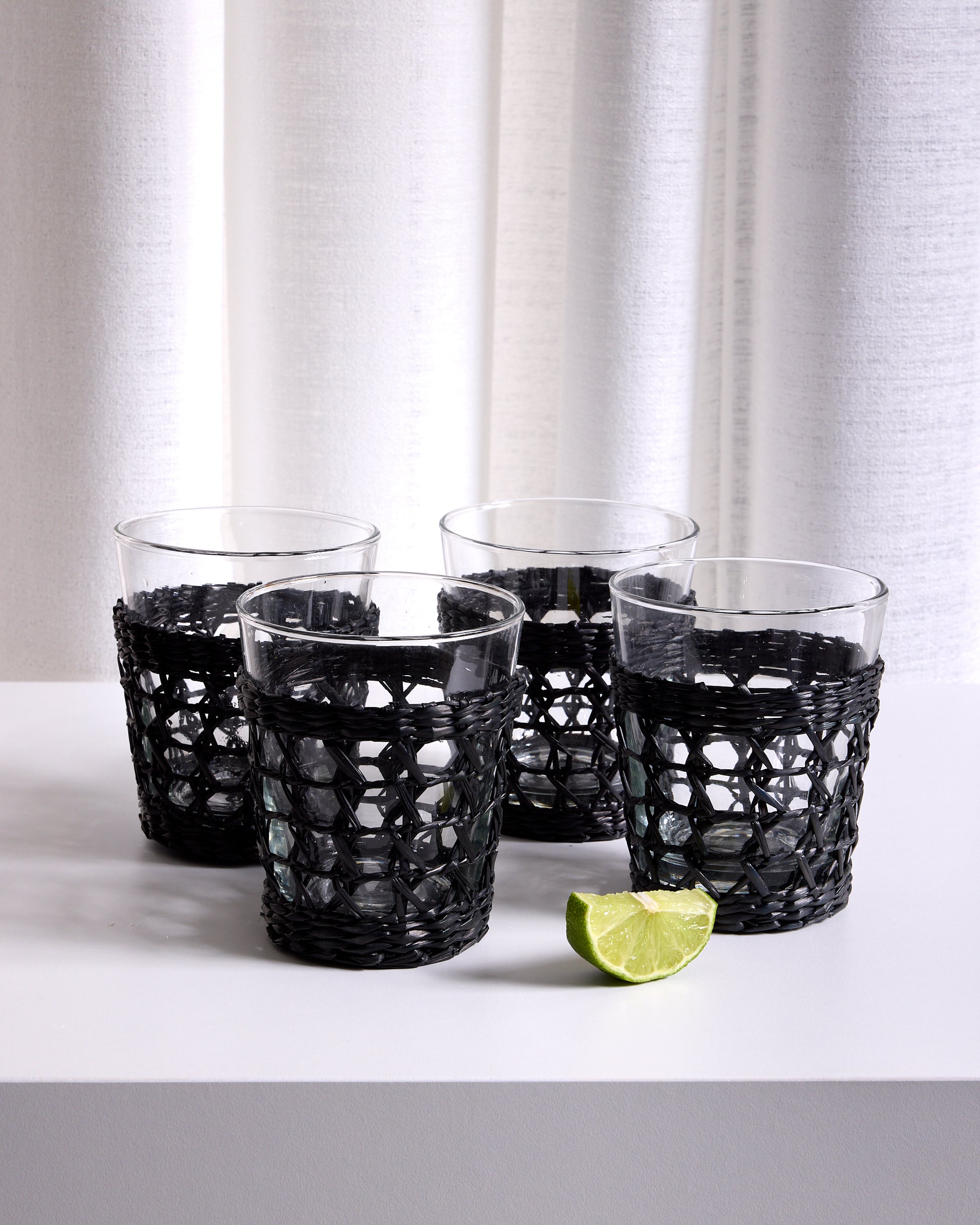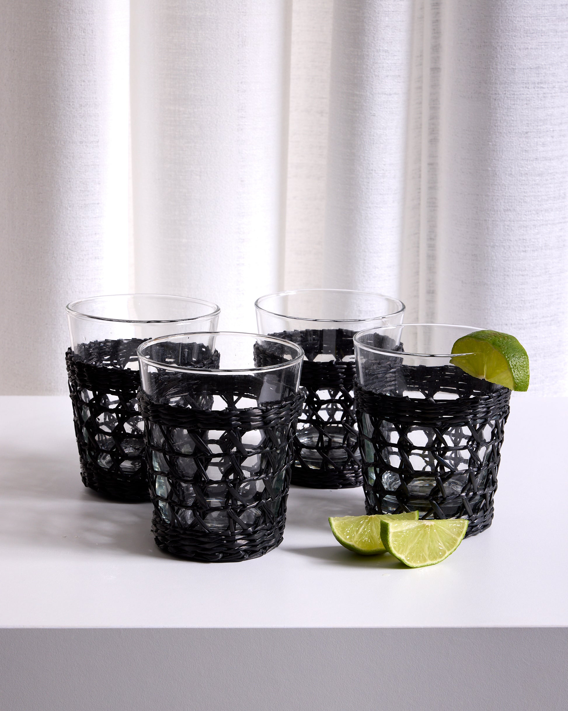 Wide double old fashion black tumbler glasses with removable natural seagrass wrapping. A festive piece for indoor or outdoor drinking & dining. Glass is dishwasher safe.
