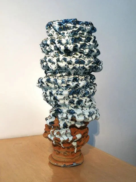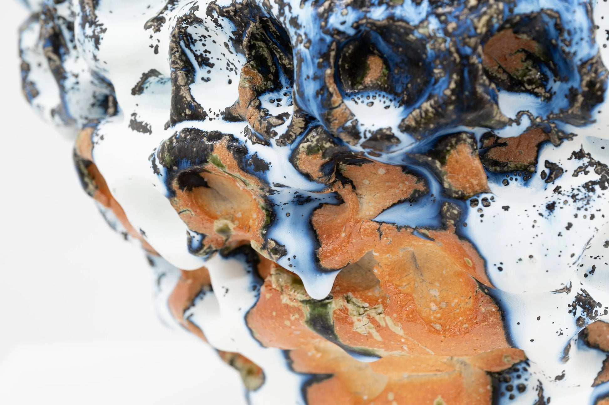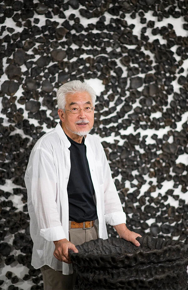 After a landslide destroyed his studio in 1979, Hoshino transformed his practice. Abandoning the potter’s wheel, he began shaping clay directly with his hands—pressing, squeezing, and building in what he described as a dialogue with the earth. This tactile process became his signature, resulting in powerful abstract forms that emphasize the raw vitality of the material itself.