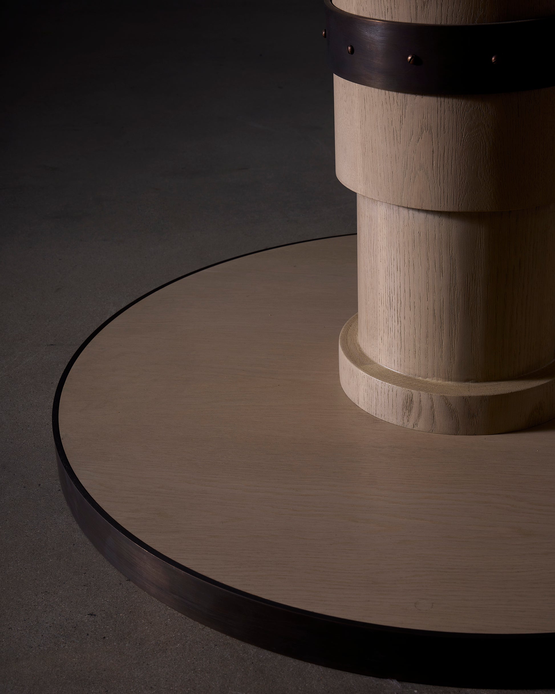 Custom dining table made with Bleached Ceruse Oak on Pedestal with Antique Brass Band.