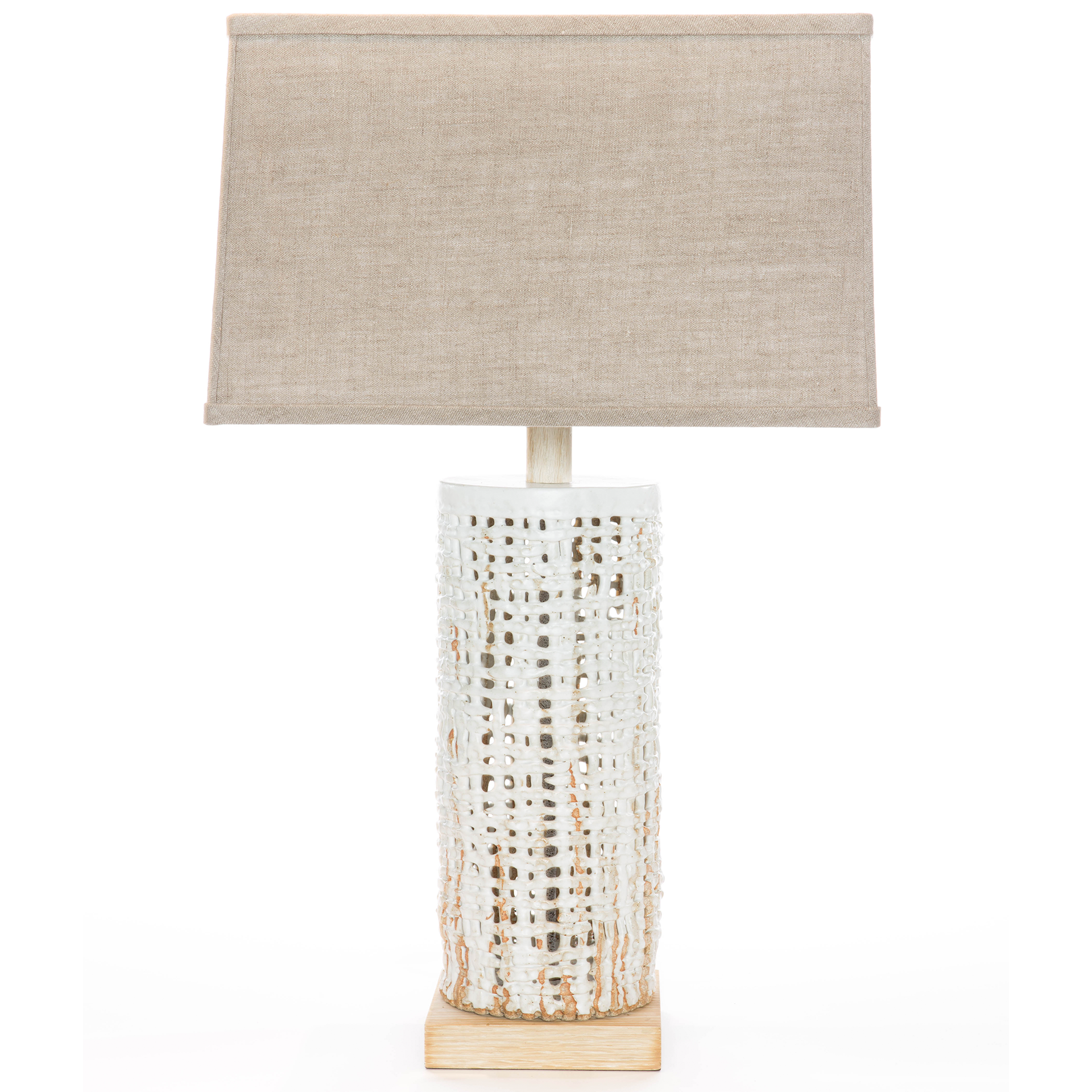 Hand-built glazed stoneware lamp with a stained wood base and custom natural linen shade. As shown: white clay body with a matte white glaze and a bleached ceruse oak base. Various finishes, glazes, and shade options available.