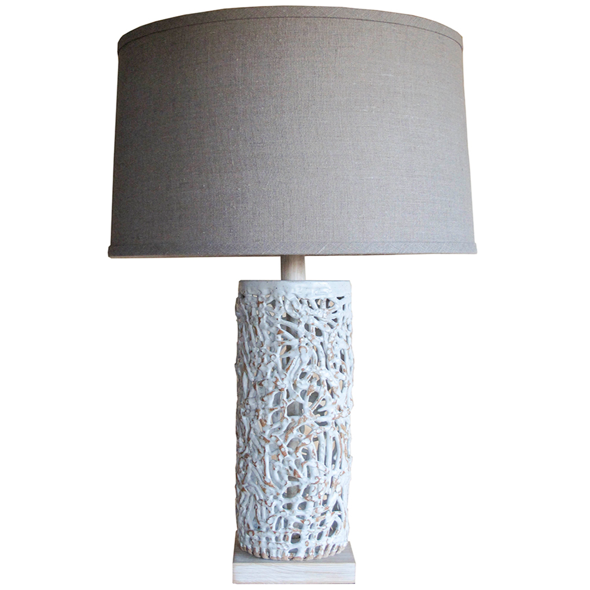 Hand-built glazed stoneware, stained wood base, custom natural linen shade.