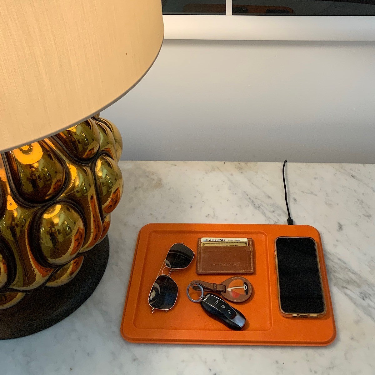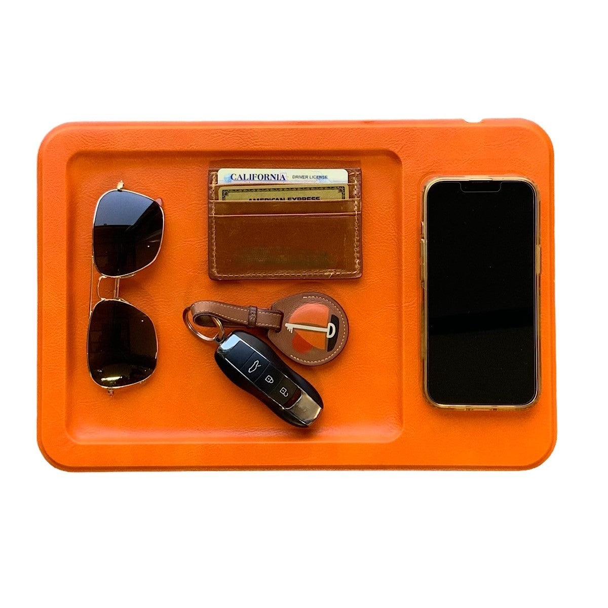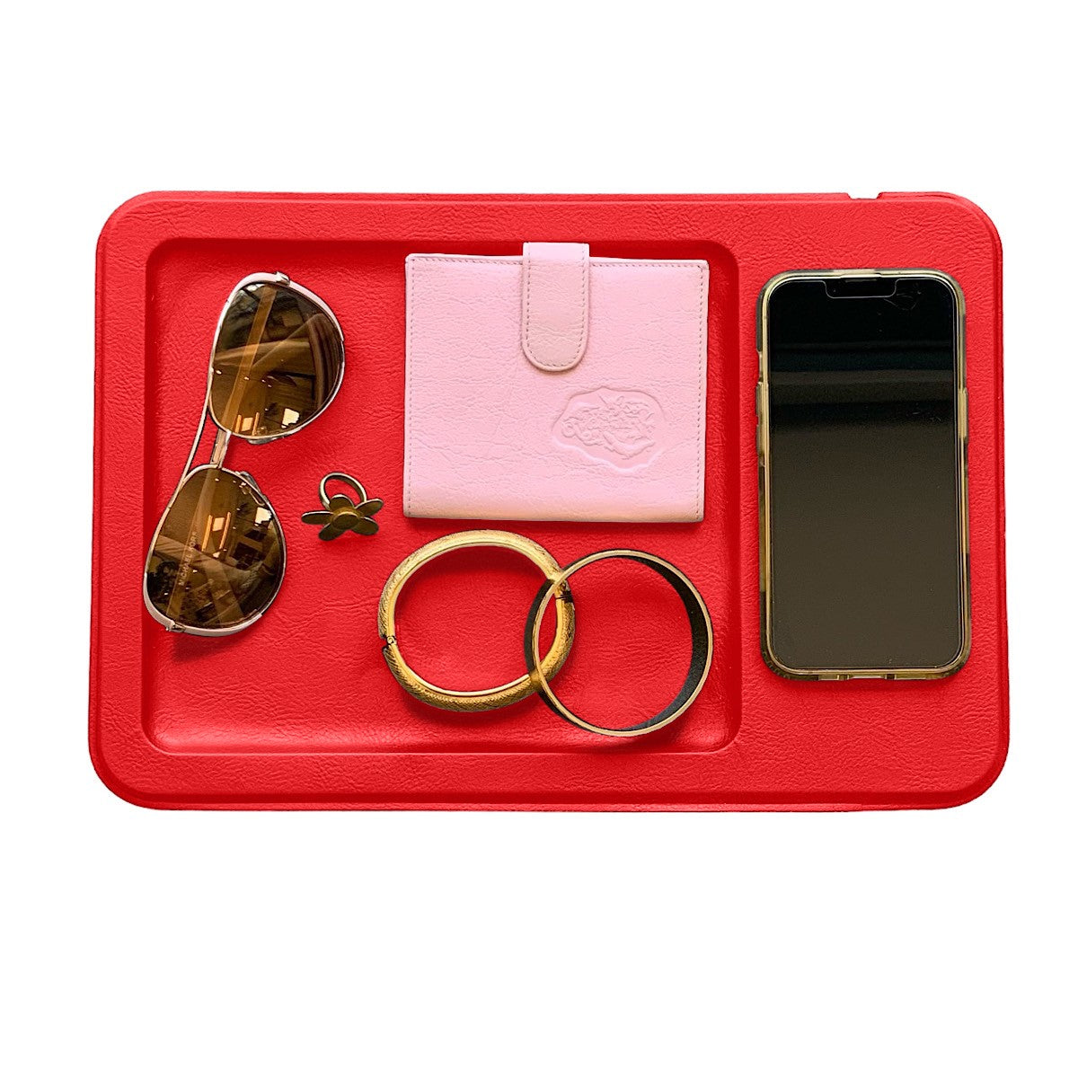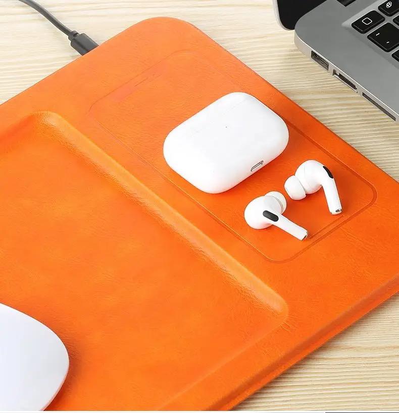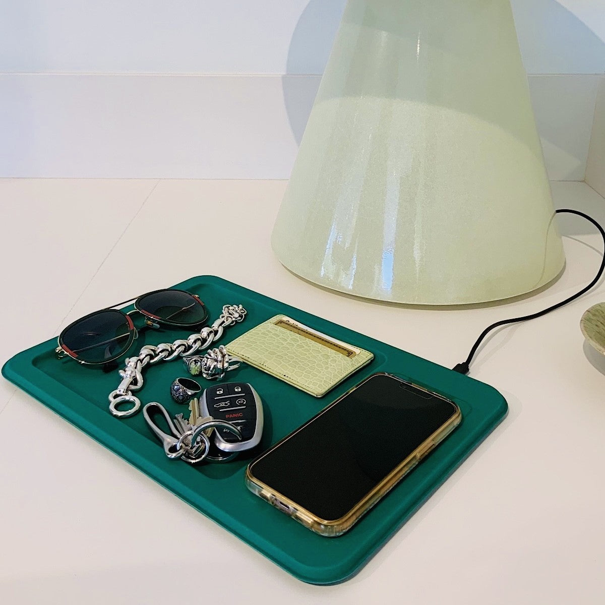 - Premium faux-leather and high-grade matte aluminum alloy charging tray with weighted, non-slip construction